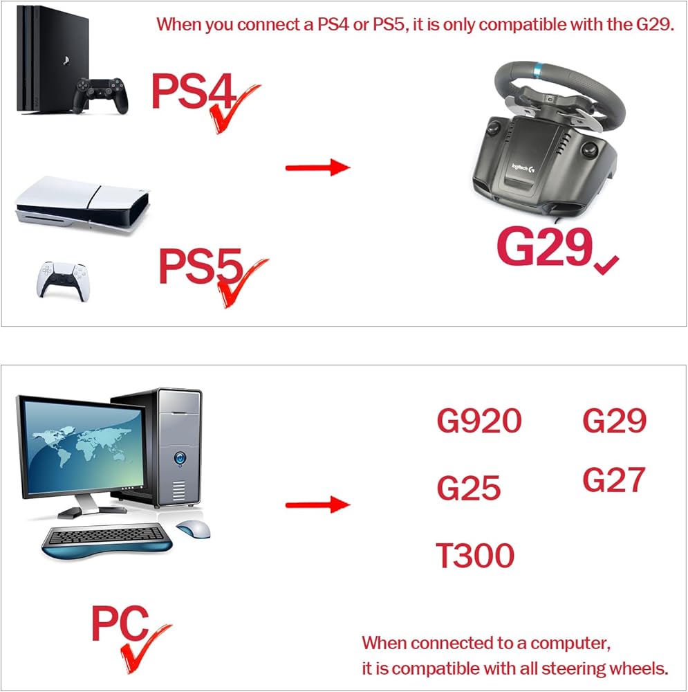 • ملاحظة: إذا قمت بالتواصل مع PS4 و PS5 ، فإنه يتكيف فقط مع G29 ، إذا كنت تتصل بجهاز كمبيوتر ، فإنه يتكيف مع جميع عجلات التوجيه.