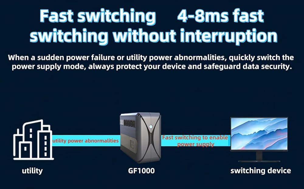 • إخراج الجهد: 120 فولت ; شهادة الأمان: FCC + CE ; GF Series GF1000: مزود الطاقة غير المنقطع 1000VA/ 500W