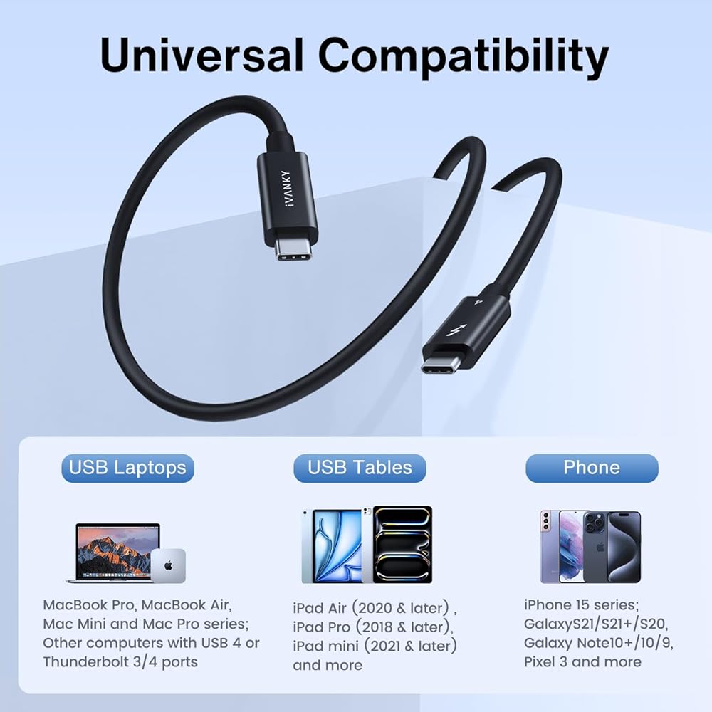 Ivanky Thunderbolt 4 Cable 2.3ft ، Intel Thunderbolt Certified ، دعم 240 واط شحن/40 جيجابت في الثانية/8K ، USB-C إلى USB-C ، كابل Thunderbolt عالي السرعة 4/3 لجهاز iPhone 16/15 ، MacBook ، iPad وأكثر من 2.3 قدم