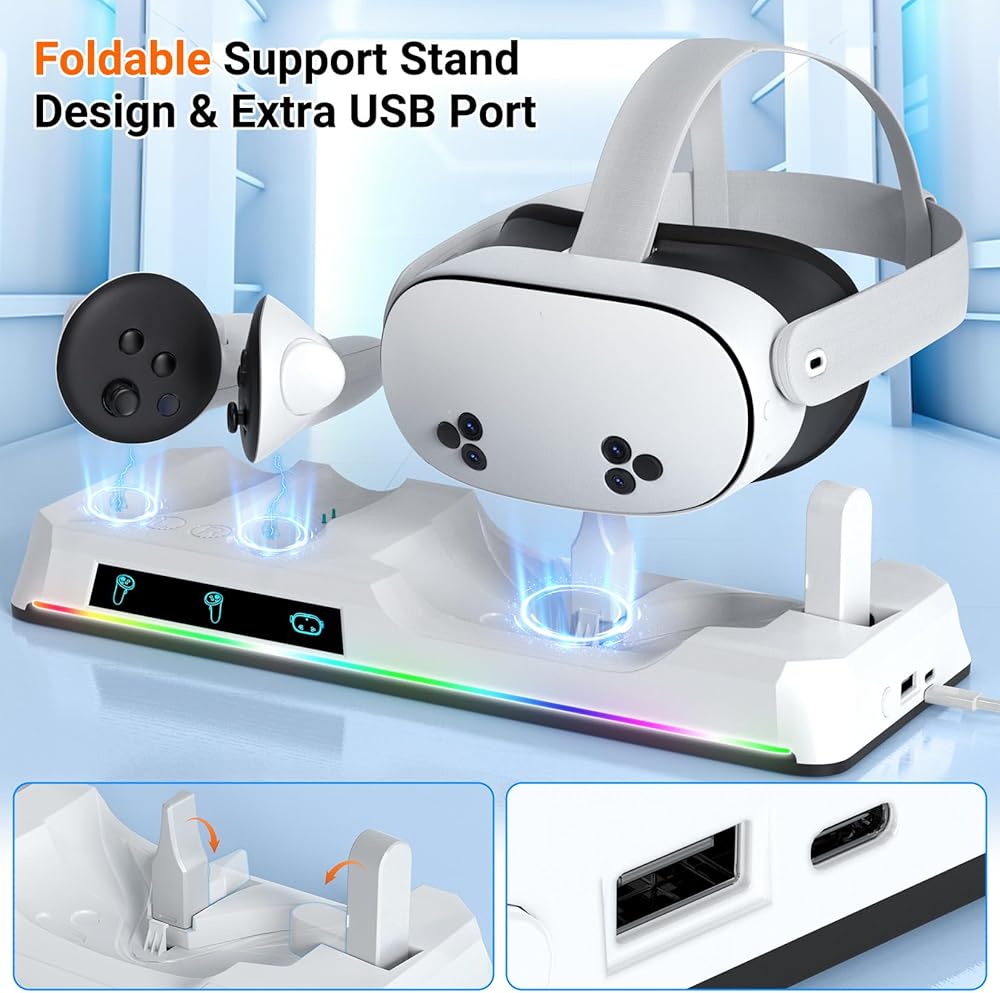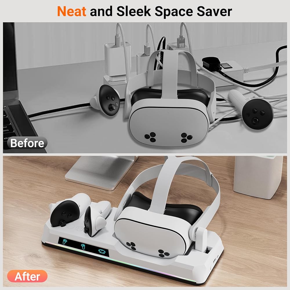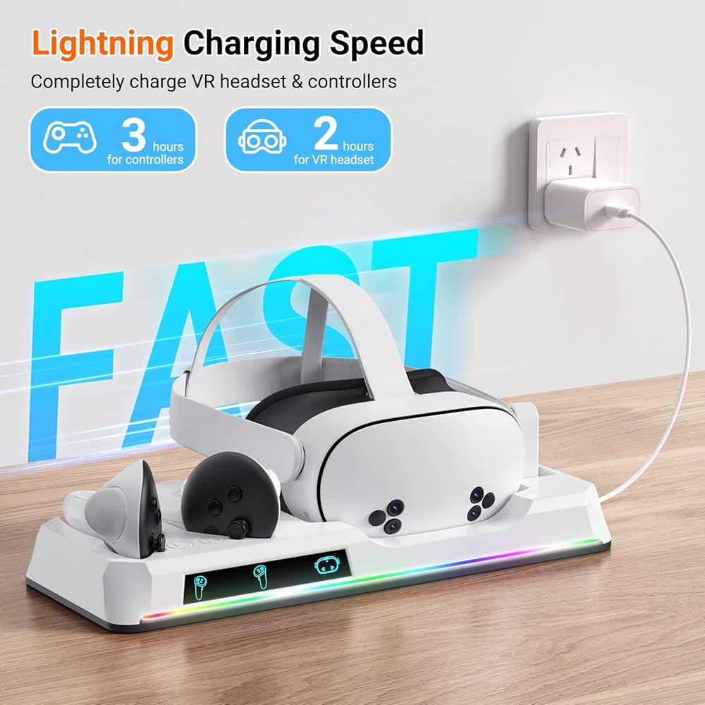 [شاحن Lightning Speed VR]: لدينا Oculus Quest 3S شحن Dock دون جهد في سماعات الرأس VR واثنين من تحكم اللمس في وقت واحد. مع سرعة الشحن السريع ، تصل أجهزتك إلى رسوم كاملة في غضون 2-3 ساعات فقط ، مما يضمن أن يكون إعداد VR جاهزًا دائمًا لمغامرتك الغامرة التالية دون أوقات انتظار طويلة.