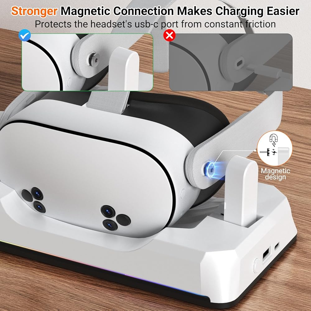 [ملحقات Magetet Meta Quest 3/3S]: قل وداعًا للكابلات المتشابكة! يتبنى Dock الشحن Oculus تصميمًا مغناطيسيًا مبتكرًا يضمن محاذاة سماعات الرأس ووحدات التحكم الخاصة بك تمامًا في كل مرة. يوفر هذا الإعداد الخالي من المتاعب شحنًا آمنًا وفعالًا مع الحفاظ على منطقة الألعاب خالية من الفوضى.