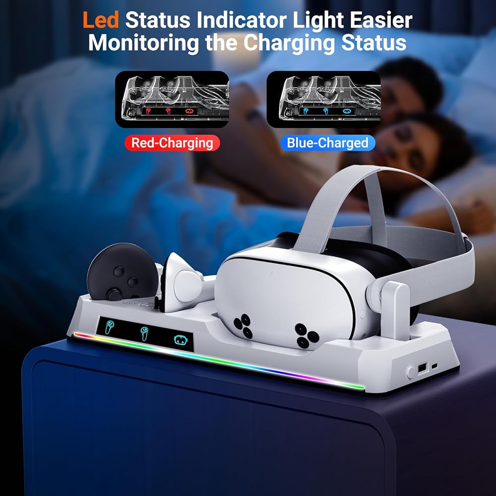 [مؤشرات LED الذكية لإكسسوارات VR Quest 3S]: ابق على اطلاع بأضواء LED الذكية. تتوهج مؤشرات Oculus Quest 3S/3 الملحقات باللون الأحمر أثناء الشحن والتبديل إلى اللون الأزرق عند الشحن بالكامل ، ومنع زيادة الشحن وتوسيع عمر البطارية. استمتع براحة البال مع العلم أن معداتك محمية ومستعدة دائمًا للذهاب.