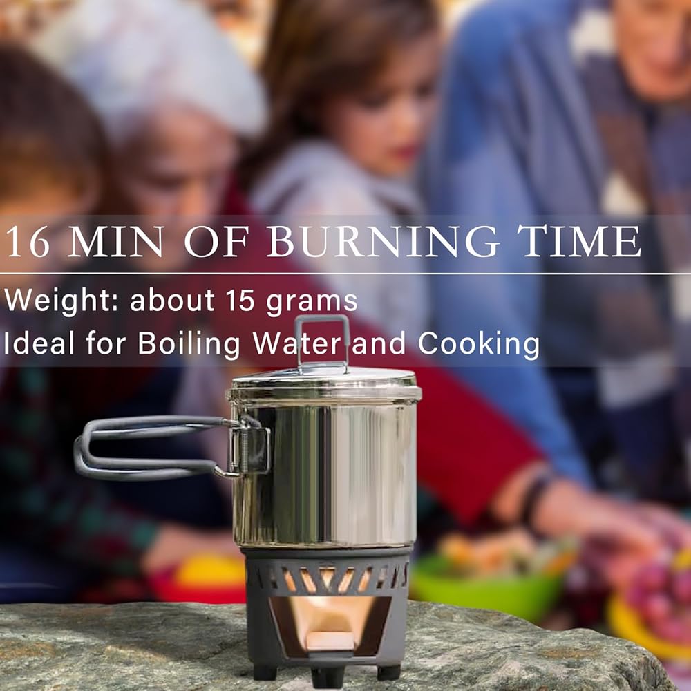 15 grams per tablets, temperatures up to 1300°F, burn time approximately 16 minutes. Can boil 500 ml of water in 8 minutes. Perfect for boiling water and cooking