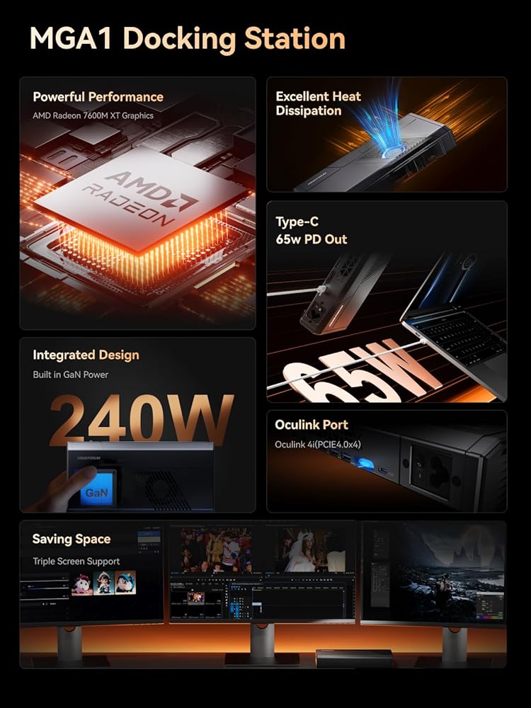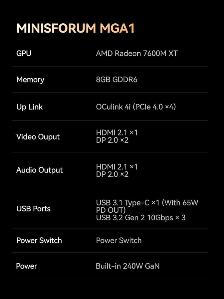 MINISFORUM MGA1 محطة إرساء GPU الخارجية ، حاوية EGPU مع AMD RADEON 7600M XT ، 1x HDMI2.1 + 2x DisplayPort2