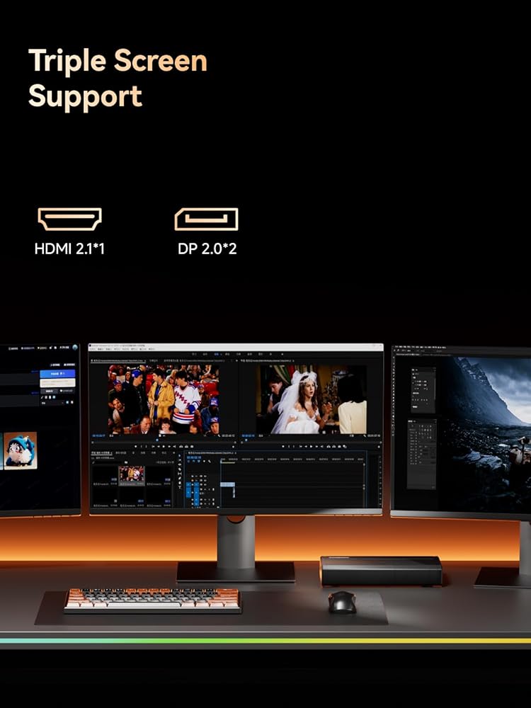 【إخراج الفيديو الثلاثي】 يأتي MGA1 مع ثلاثة مخرجات فيديو ، 1x HDMI2.1 و 2x DP1.4 ، يمكنه توصيل ثلاثة شاشات دون مشاكل.