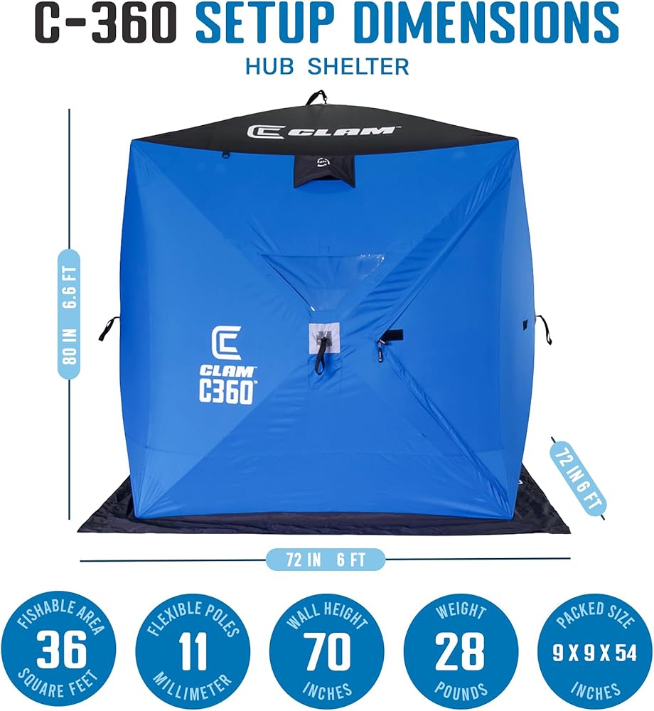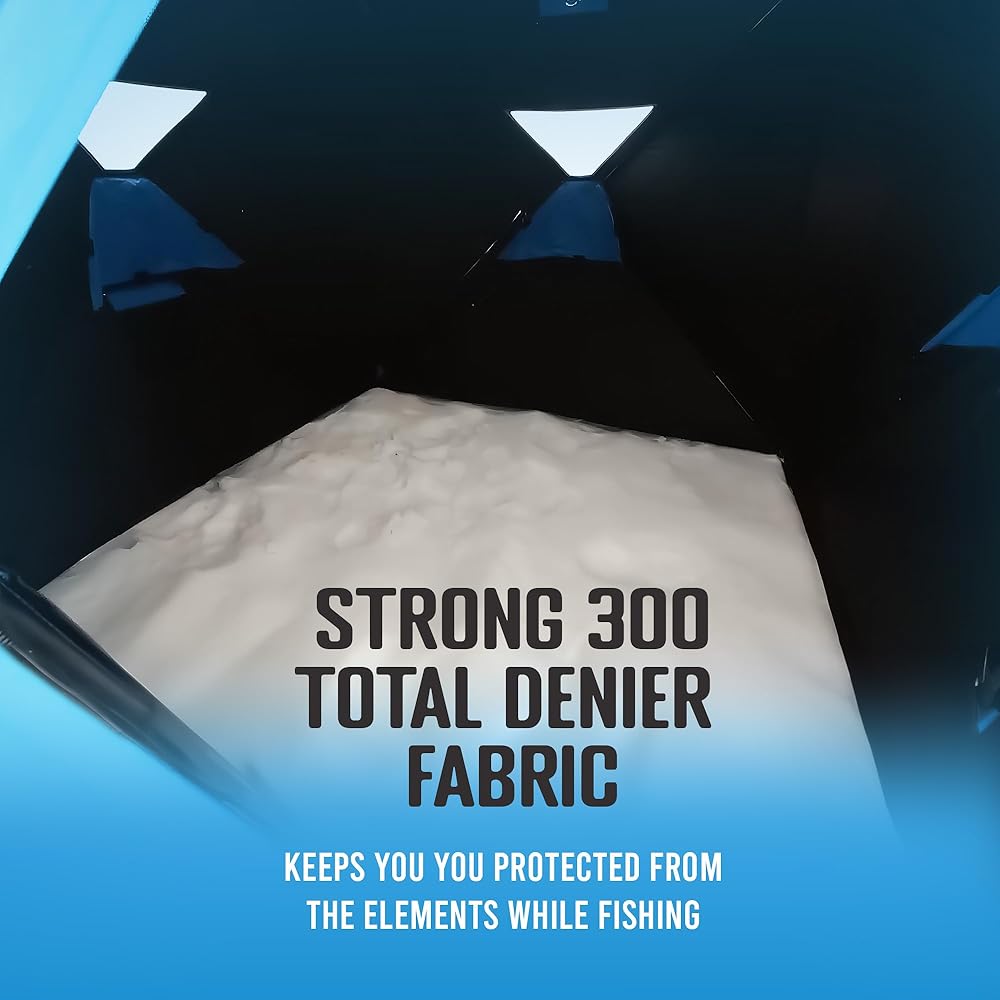 يأتي مع تنورة كبيرة الحجم للبنوك الثلجية الواسعة بالإضافة إلى ربطات التعادل ومثبتات الجليد ؛ تزن خيمة صيد الجليد 60 رطلاً وتتميز بمساحة 56 قدم مربع