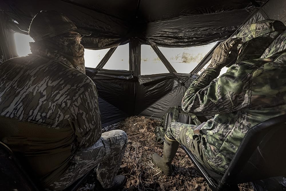 Crafted from black-backed, water-resistant heavy-duty 500D fabric, the interior of the Mancave ensures superior concealment while withstanding the elements. Equipped with four full-width panoramic shooting windows, you'll have unmatched visibility and ample opportunities to line up the perfect shot from any angle.