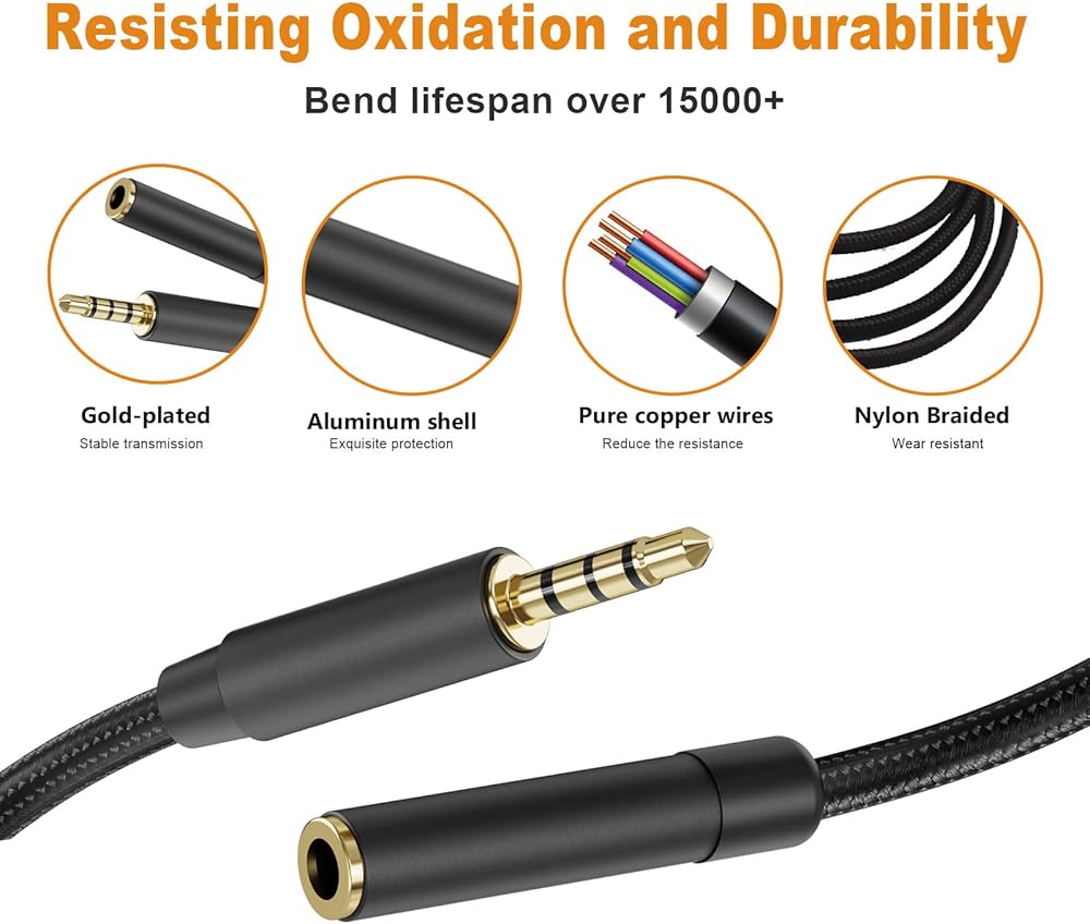【المواد المتميزة】 الأسلاك النحاسية المضفرة توفر أقصى قدر من الموصلية الكهربائية والمتانة. الموصلات المطلية بالذهب لتجنب الأكسدة والتآكل. يمكن أن تتحمل مواد شبكات القطن و TPE اختبار 15000 + عمر لإعطاء قوة موثوقة. يمكن أن يستمر كابل امتداد سماعة الرأس لسنوات من الاستخدام. يتميز موصل كابل التمديد 3.5 مم بحلقة أخطو. من السهل أيضًا إدخاله دون الحاجة إلى إزالة هاتفك أو حالة الكمبيوتر اللوحي