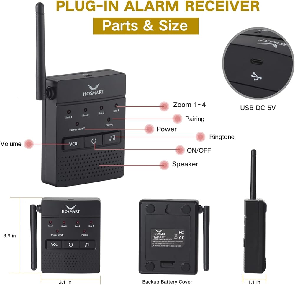 Hosmart Advantage-30 Years+ Outdoor Drainway Alarm Wireless and Drainway Alert System التي تم إنتاجها في مصنعنا الخاص مع تقنية أنظمة Edge الخاصة بنا. يشمل إنذار الممر غير القانوني مستقبلًا أساسيًا يعمل بالبطارية/AC و 4 أجهزة استشعار.