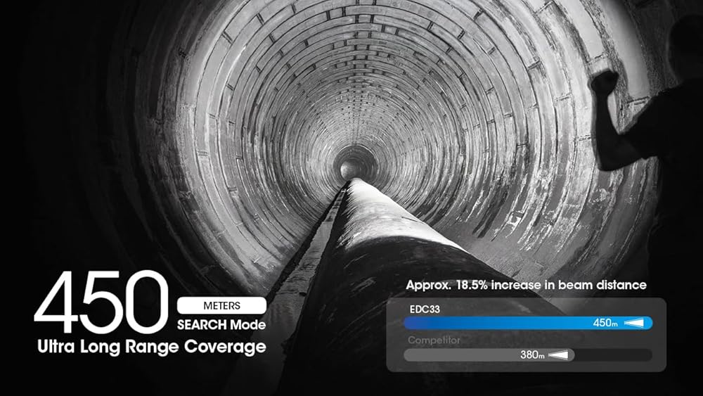 Maximum peak beam intensity of 54,500 cd and maximum range of 450 meters