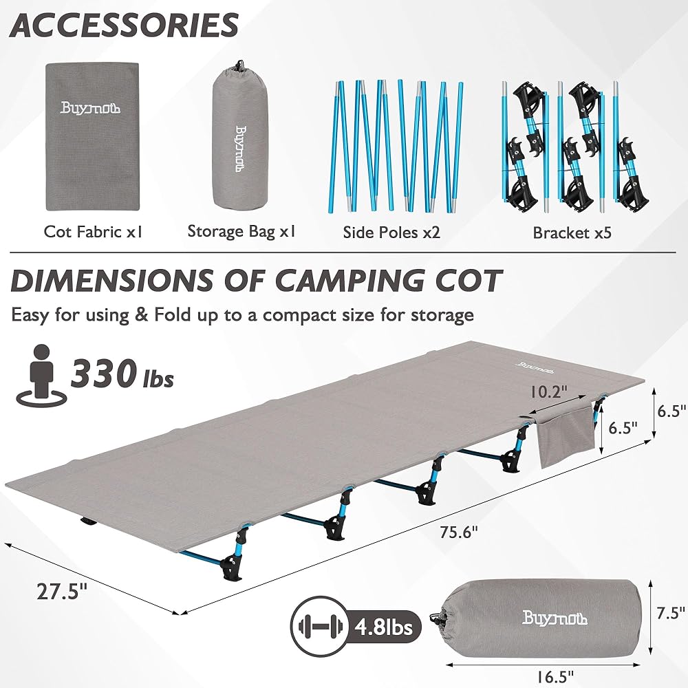 مدمجة وخفيفة الوزن ومحمولة: مطوية في حجم مضغوط: 16.5 '× 7.5' 'x 5.1' 'وتزن 4.85 رطلاً فقط ، والتي يمكن أن يحملها الأطفال الصغار بسهولة. Buymoth Camping أسرة مضغوطة وخفيفة الوزن ومحمولة ، مما يجعلها مثالية للمعسكرات والرعب والمتنزهين والرحالة والمغامرين.