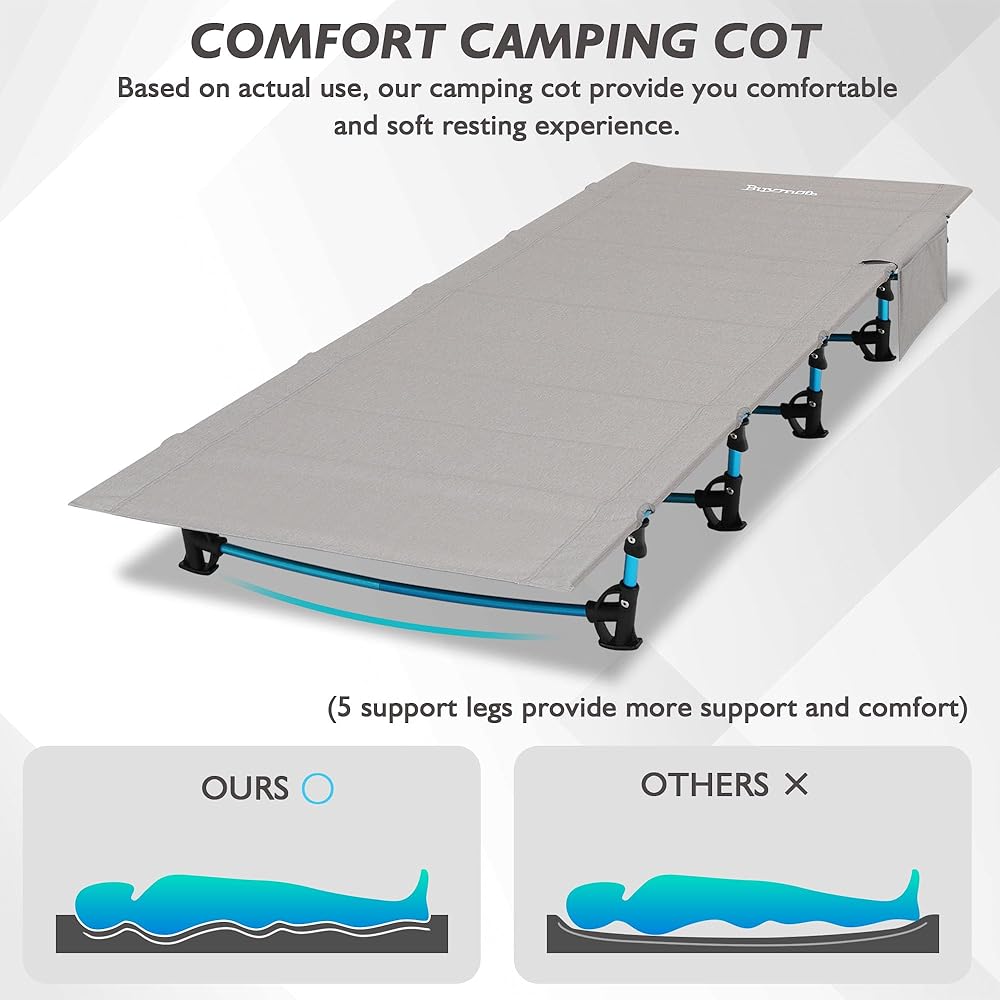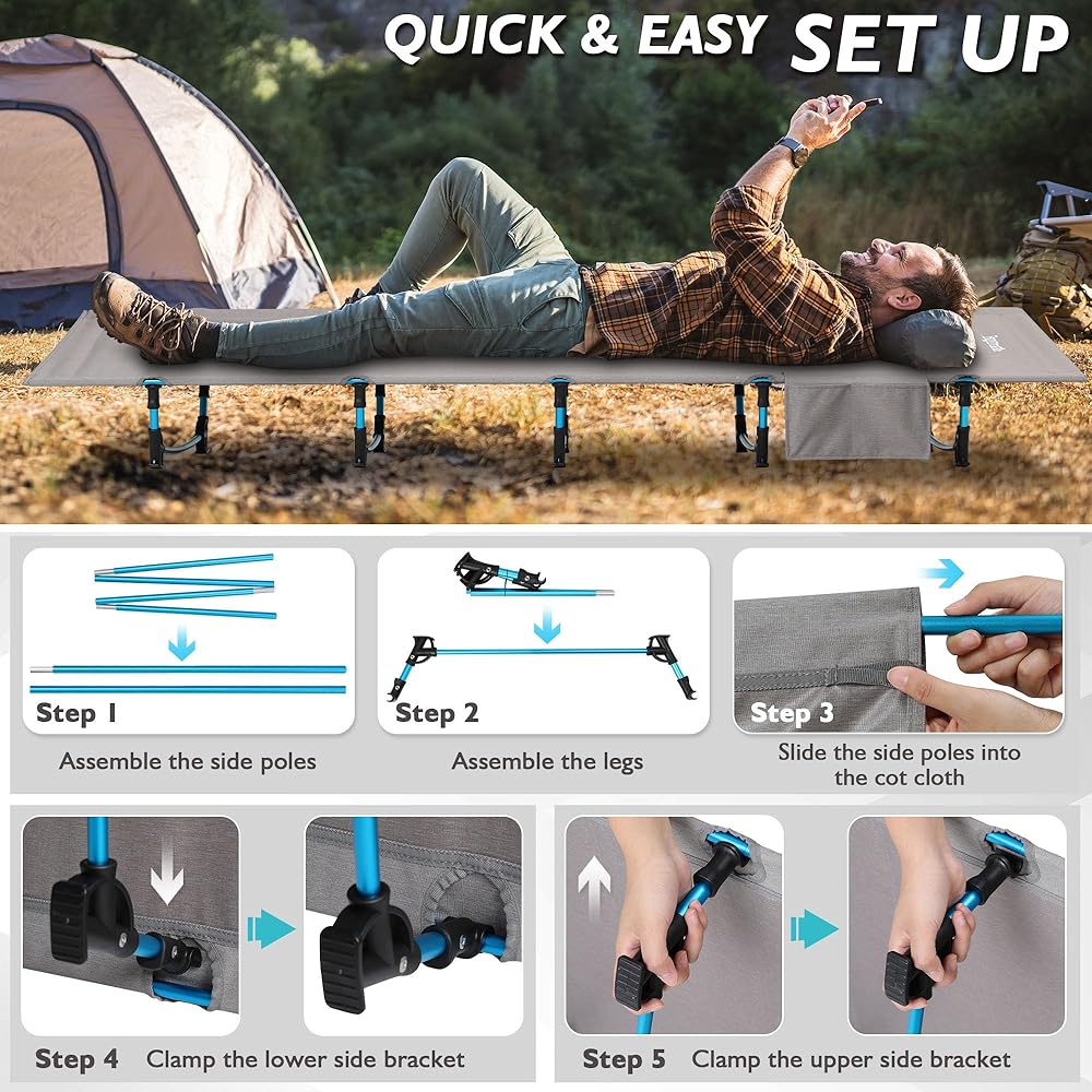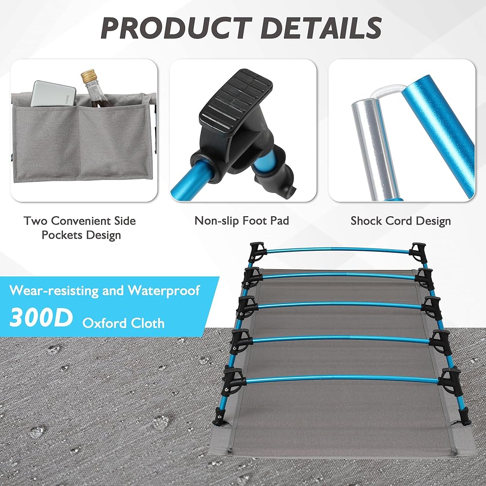 قوي ومستقر: يتكون إطار سرير التخييم القابل للطي من سبائك الألومنيوم من الدرجة 7075 ، وهو أكثر من ضعف سبيكة الألومنيوم العادية. يحتوي سريرنا القابل للطي على تصميم هيكل ثلاثي ، من أجل تحسين الاستقرار ، لتحقيق قدرة الحمل البالغة 330 رطلاً.