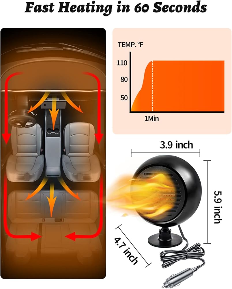 التسخين السريع: يتميز بمنفذ هواء كبير ، يسخن سخان السيارات المحمولة بفعالية سيارتك أو مساحة المعيشة في دقيقة واحدة فقط. مثالي لتلك الصباح الباردة عندما تكون الراحة الفورية ضرورية.