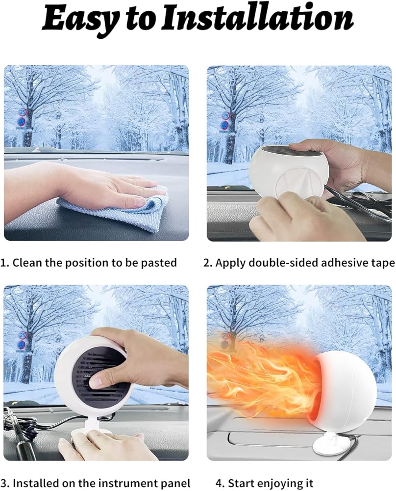 سهلة التثبيت والتوظيف: مع سلك طاقة 52 بوصة وقاعدة لاصقة على الوجهين ، يمكن تثبيت هذا المدفأة على لوحة القيادة الخاصة بك. هذا يضمن أن السخان آمن ويمكن الوصول إليه ، مما يوفر الراحة النهائية.