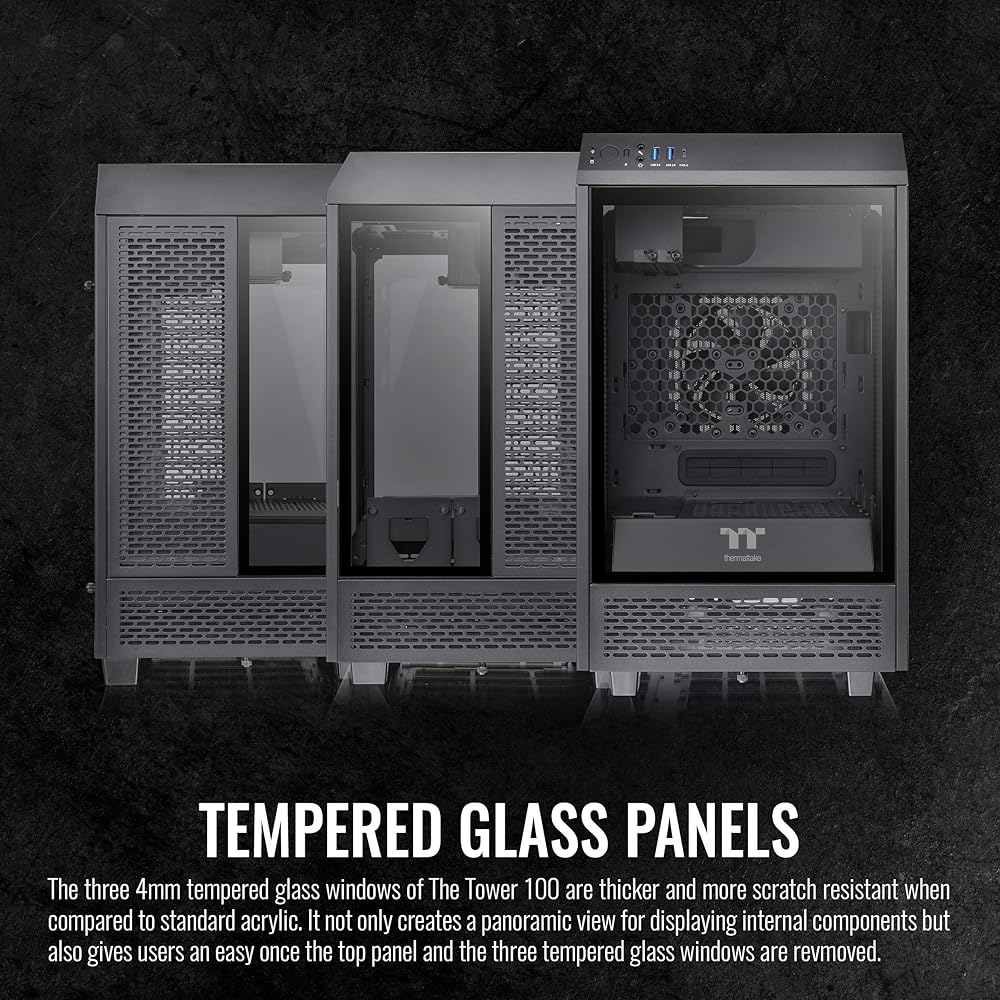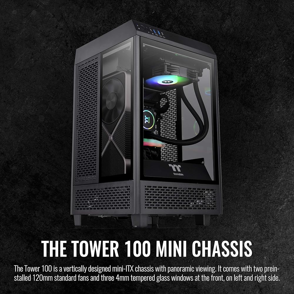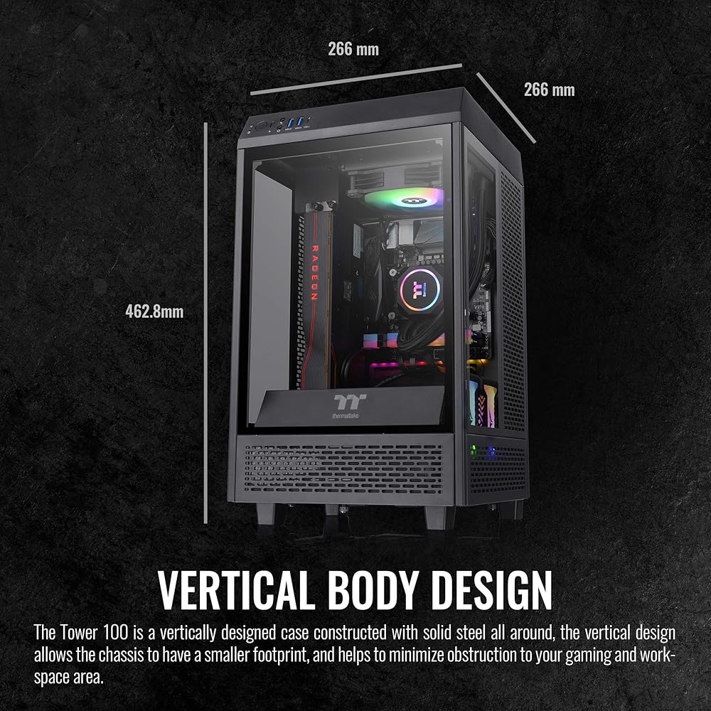 Introducing the Thermaltake Tower 250 mITX Mini Tower, featuring the same octagon design the Tower series is known for while being shrunk down to accommodate mITX builds. Coming in at 19.9 in (506mm) Tall, 11.8in (300mm) Wide, and 11.5in (281mm) in depth the Tower 250 leaves a small footprint while still being able to support GPUs up to 360mm in length as well as Radiators up to 360mm in size. Preinstalled are 2x120mm CT fans located at the top of the chassis to provide exhaust. •P/N: CA-1Z9-00S1WN-00 •Model: The Tower 250 •Series: The Tower •Case Type: Mini Tower •Dimensions: 506 x 300 x 281 mm (19.9 x 11.8 x 11.5 inch) •Weight: 7.1 kg / 15.65 lbs. •Side Panel: 3mm Tempered Glass x 3 •Color: Black •Material: SPCC •Cooling System: Top(exhaust): 120 x 120 x 25 mm CT120 fan (2000rpm, 25.8 dBA) x 2 •Drive Bays: 1 x 3.5”, or 2 x 2.5” •Expansion Slots: 3 •Motherboard: 6.7" x 6.7" (Mini ITX) •I/O Port: USB 3.2 (Gen 2) Type-C x 1, USB 3.0 x 2, HD Audio x 1 •PSU: Standard SFX or ATX PSU (optional) •Fan Support: Top: 2 x 120mm, 1 x 120mm ; Right Side: 3 x 120mm, 2 x 120mm, 1 x 120mm, 2 x 140mm, 1 x 140mm ; Rear: 2 x 120mm, 1 x 120mm, 2 x 140mm, 1 x 140mm ; Power Cover: 1 x 120mm, 1 x 140mm •Radiator Support: Right Side(AIO): 1 x 360mm, 1 x 240mm, 1 x 120mm ; 1 x 280mm, 1 x 140mm •Clearance: CPU cooler height limitation: 210mm ; VGA length limitation: 245mm(With power cover) 360mm(Without power cover) ; PSU length limitation: 200mm