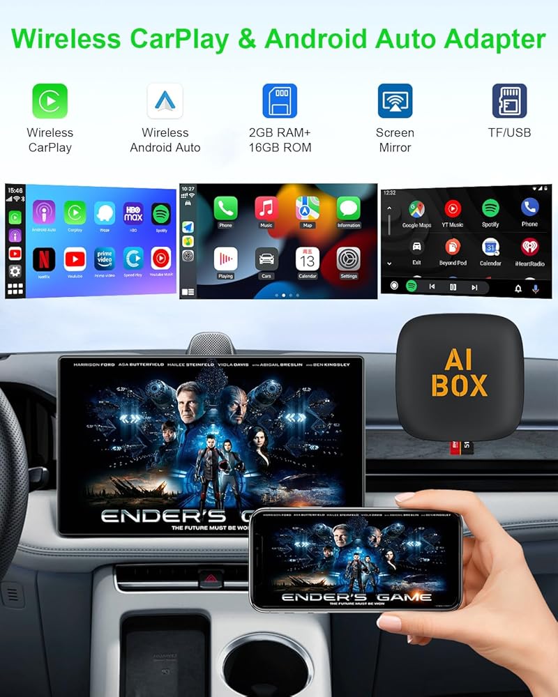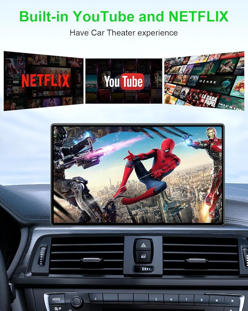 【استمتع بتجربة البث play wireless car play dongle for iPhone يحتوي على netflix المدمج ويوتيوب ، ويمكنه تشغيل جميع أنواع مقاطع الفيديو المثيرة للاهتمام ، فأنت لست بالملل أثناء القيادة. بالإضافة إلى ذلك ، فإن محول CarPlay اللاسلكي Netflix أيضًا فتحة بطاقة TF وميناء USB مدمج ، بحيث يمكنك استخدام بطاقة Micro SD أو محرك أقراص USB لتشغيل مقاطع الفيديو أو الموسيقى في وضع عدم الاتصال عندما لا يكون هناك WiFi أو نقطة اتصال. مع مساحة تخزين واسعة (ذاكرة الوصول العشوائي 2GB+16 جيجابايت ، دعم بطاقة TF تصل إلى 256 جيجابايت) ، لن تقلق بشأن نفاد المساحة.