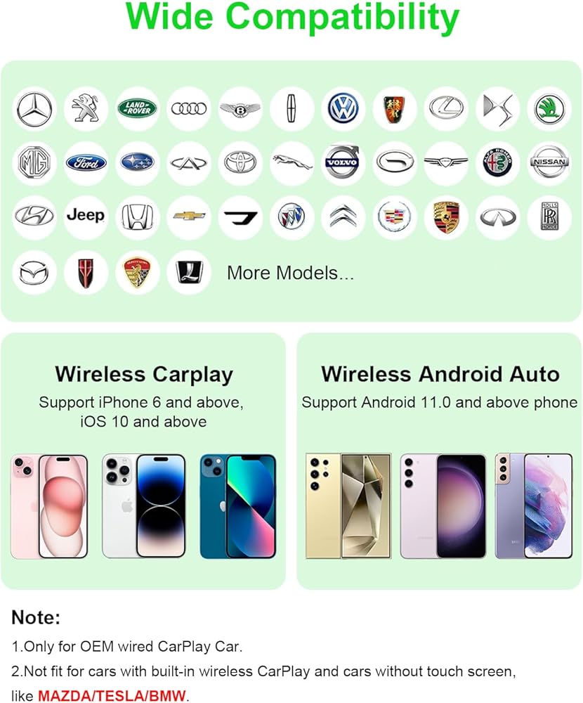 【التوافق الواسع】 هذا محول CarPlay و Android Auto يأتي مع كابل USB-C إلى USB-A/USB-C ، مناسب لأكثر من 800 طراز سيارات بعد عام 2016 مع Carplay السلكي المصنع. ملاحظة: غير متوافق مع BMW ، Tesla. قبل إجراء عملية شراء ، يرجى الرجوع إلى الصورة المقدمة لتأكيد ما إذا كانت سيارتك مدعومة. في حالة عدم إدراج نموذجك ، لا تتردد في الاستفسار عن توافقه. ويدعم الهواتف المحمولة مع Apple الإصدار 10.0 وما فوق و Android 11.0 وما فوق.