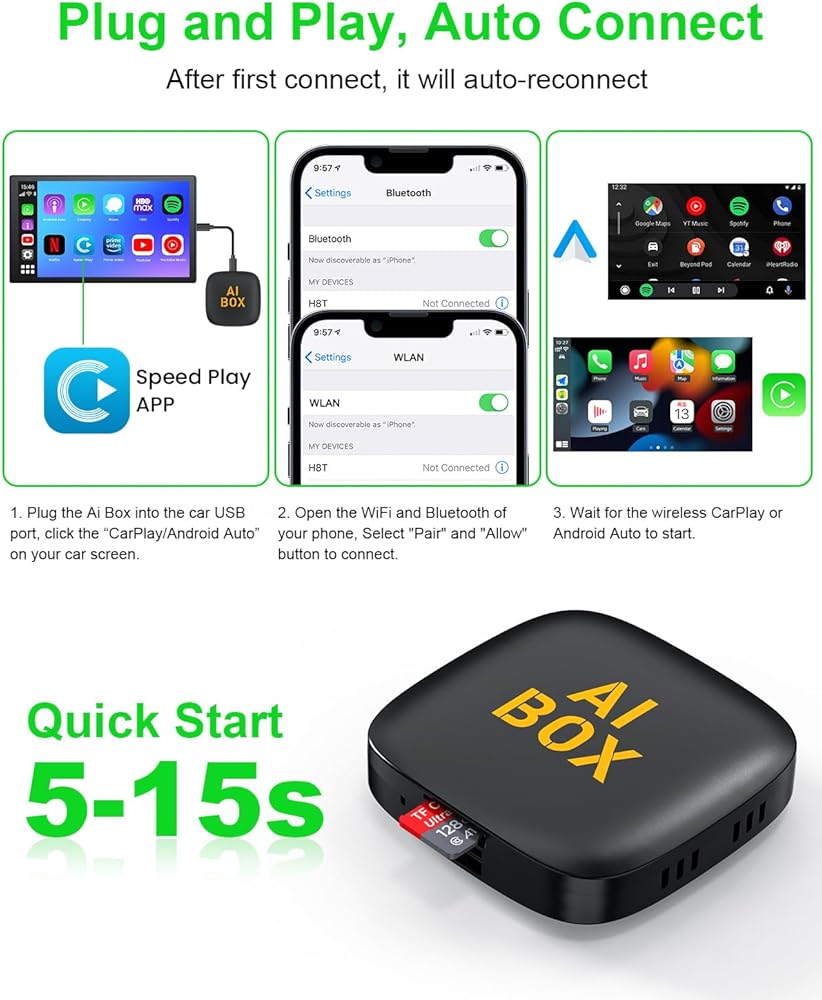 【رقاقة تمت ترقيتها ، سريعة ومستقرة】 ، يتميز محول CarPlay اللاسلكي بتقنية جديدة ذكية وتصفية إشارة متقدمة لضمان اتصال مستقر وموثوق. تعمل أحدث التقنيات أيضًا على تعزيز إشارة Wi-Fi ، مما يضمن عدم وجود تأخير أثناء الاستخدام اليومي. بعد الإعداد الأول ، يمكن التعرف عليه بسرعة وتلقائيًا في كل مرة تدخل فيها السيارة. فقط قم بتوصيل وتشغيل في 5-15 ، لا حاجة إلى محرك أقراص إضافي ، تطبيقات.