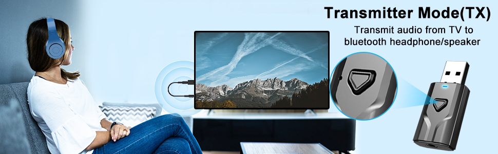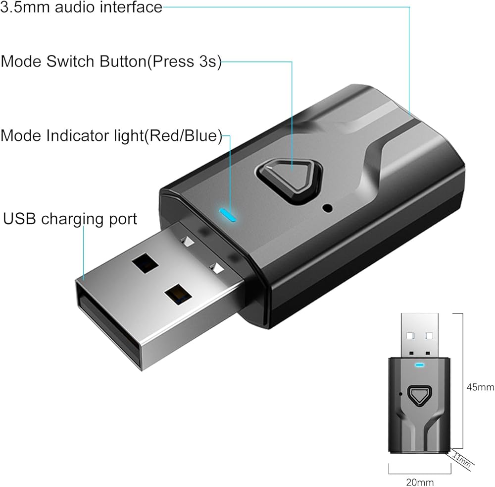 جهاز استقبال جهاز الإرسال Bluetooth: يمكن استخدام محول Bluetooth المحمول إما كمرسل أو مستقبل. في وضع TX ، يتم توصيله بأجهزة غير بويوتوث مثل أجهزة التلفزيون وأجهزة الكمبيوتر والترفيه الطائرات وتنقل الصوت إلى سماعات/مكبرات الصوت Bluetooth ؛ في وضع RX ، يمكن توصيله بنظام ستيريو أو مكبر صوت أقدم ودفق الموسيقى من الهواتف الذكية أو الجهاز اللوحي من خلال مقبس ستيريو 3.5 مم.