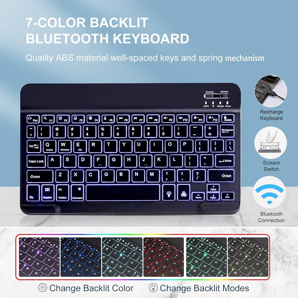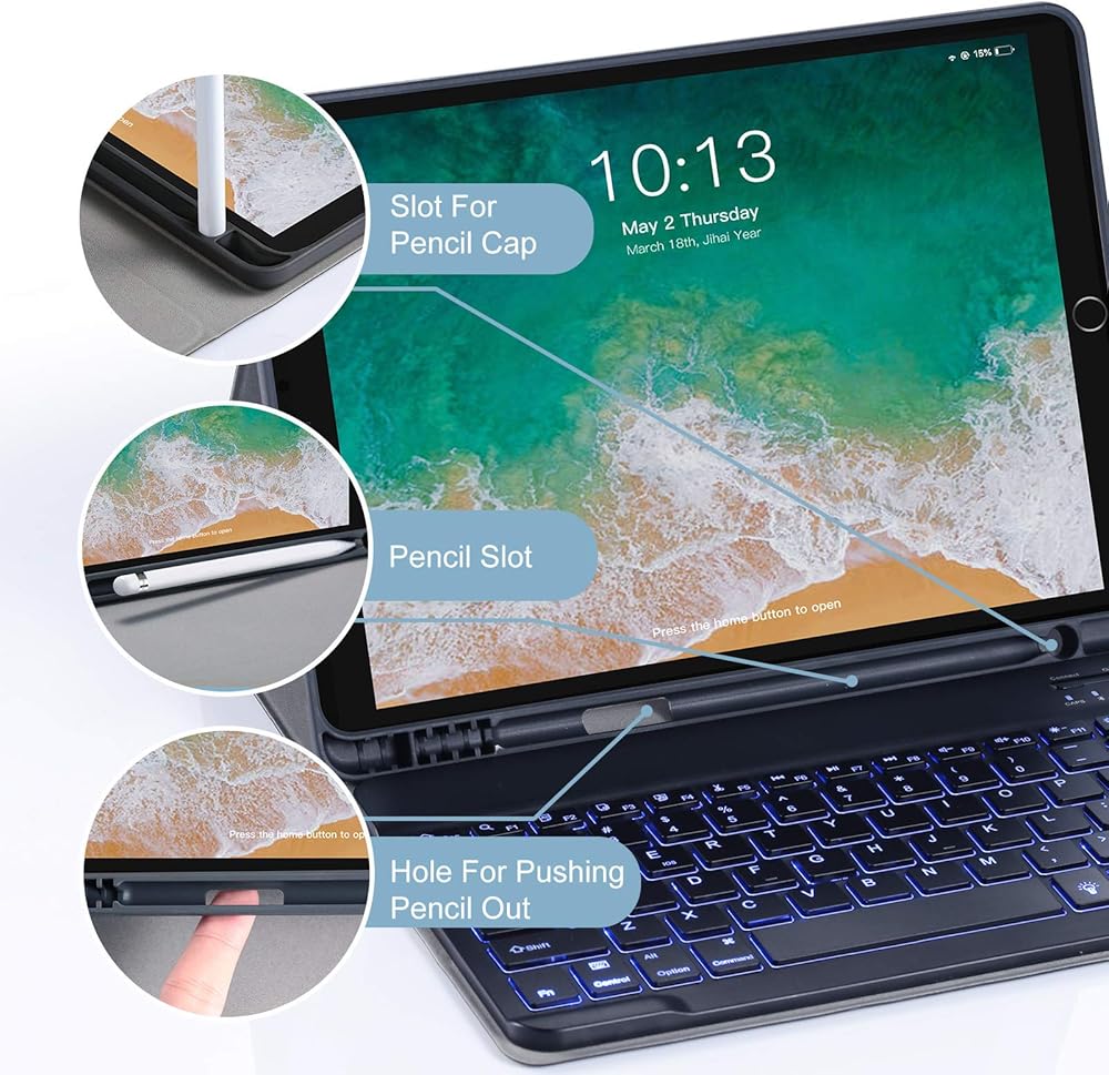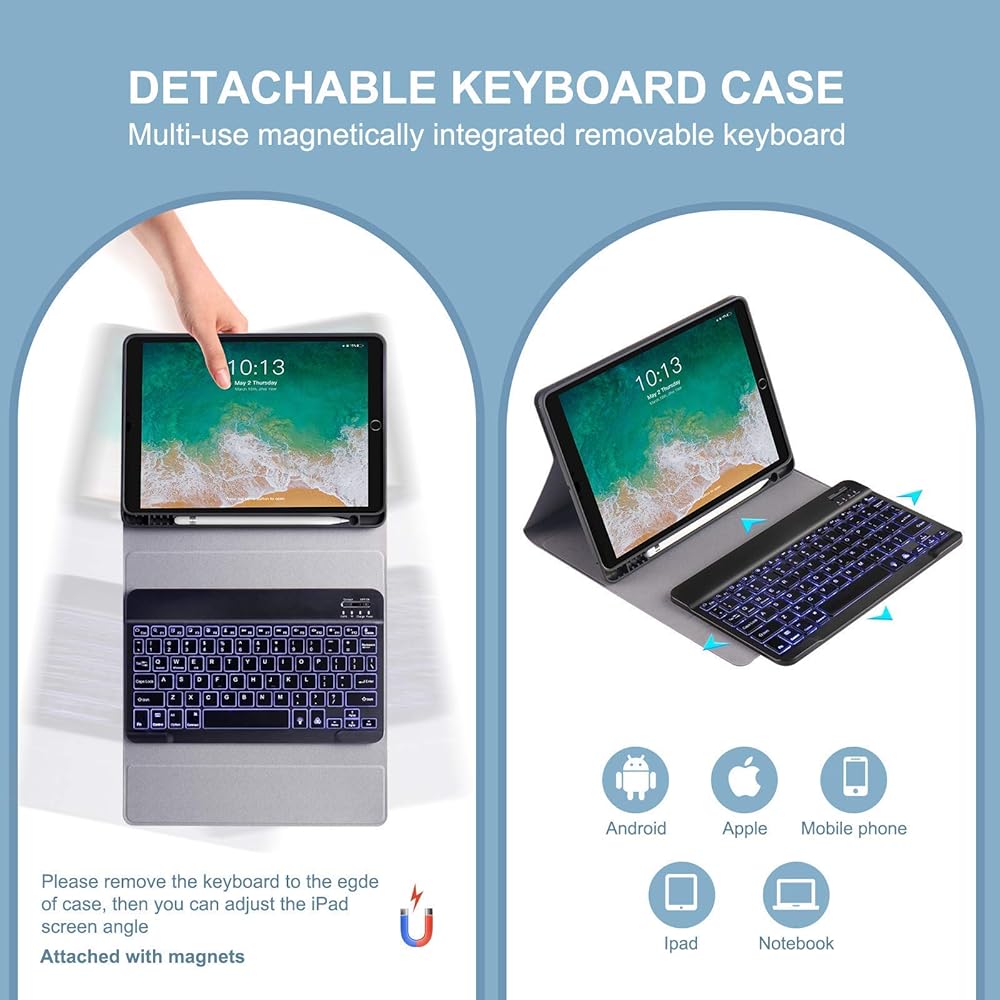 【لوحة مفاتيح iPad القابلة للفصل مغناطيسيًا】 لوحة مفاتيح iPad المغناطيسية والحالة مفصولة ، مرفقة مغناطيسيًا ، يمكن إزالة لوحة المفاتيح من العلبة. 3 مستويات من السطوع و 7 ألوان نابضة بالحياة تجعل الكتابة ممتعة وسهلة في الظلام أو الضوء. يمكن إرفاق لوحة المفاتيح بالحالة المغناطيسية ، إن لم يكن مطلوبًا ، يمكن إزالتها.