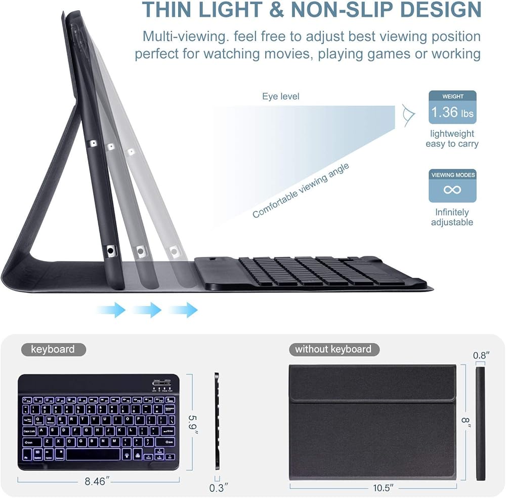 【وظيفة النوم التلقائي/الاستيقاظ】 ميزة النوم/الاستيقاظ المغناطيسية تعمل بسلاسة وسلاسة للمساعدة في تمديد عمر بطارية iPad. سهولة التشغيل وتوفير الطاقة. تتيح القواطع الدقيقة الوصول بسهولة إلى جميع المنافذ والكاميرا والمكبرات الصوت وسماعات الرأس وعناصر التحكم في مستوى الصوت. لتحقيق التأثير المثالي لإيقاظ النوم ، يرجى إزالة لوحة المفاتيح ، لأن لوحة المفاتيح مع الحديد ستعيق الجذب المتبادل بين المغناطيس.