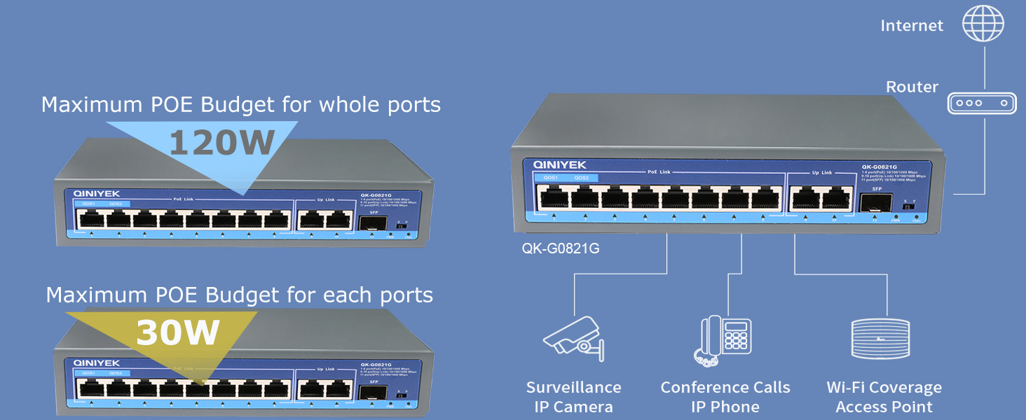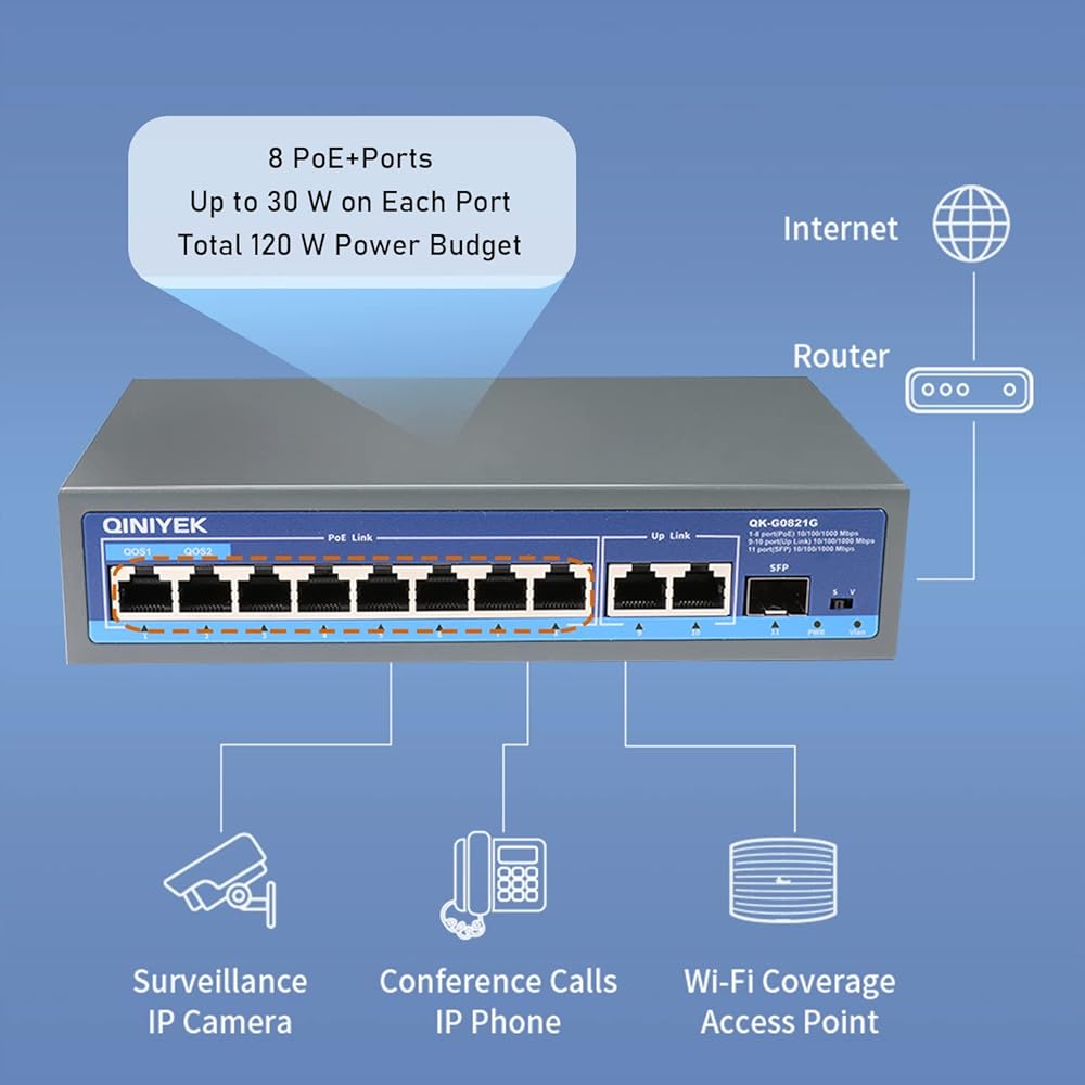 【8 منافذ PoE @120W】 منفذ POE 8*100/1000 ميجابايت في الثانية، يوفر 8*10/100/1000 ميجابايت في الثانية حزمة بيانات قابلة للتكيف عالية السرعة غير مفقودة.