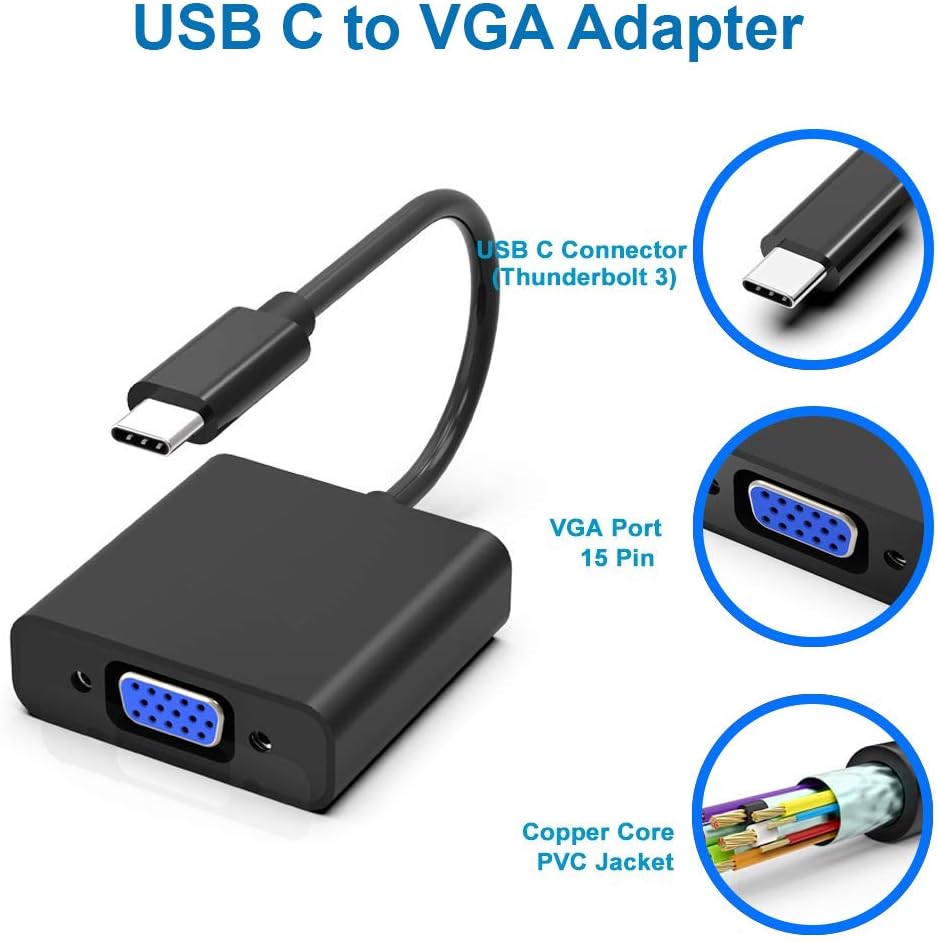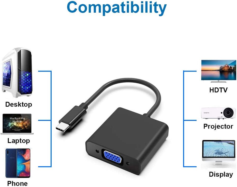 USB Type C to VGA adapter connects a computer, desktop, laptop, or other devices with USB-C port to a monitor, projector, HDTV, or other devices with VGA port. Built-in advanced IC chip converts USB-C digital signal to VGA signal; The USB Type-C source should supports the USB Type-C Alt Mode. Great Performance: The USB-C to VGA adapter supports resolutions up to 1920*1200@60Hz including 1080P, 720p, 1600x1200, 1280x1024 for high definition 1080p Full HD monitors or projectors; Plated USB-C connector resists corrosion and abrasion and improve the signal transmission performance; Molded strain relief increases cable durability. Compatible with 13"/15" MacBook Pro 2019, 2018, 2017, 2016 iMac, MacBook, MacBook Air, Google Chromebook Pixel, Lenovo 900, Dell XPS 13 (9350), Dell XPS 15 9550, Dell XPS12 9250, Dell Precision 5510, HP Spectre X2, HP Spectre x360, HP EliteBook Folio G1, HP Elite x2 1012 G1, Acer Switch Alpha 1, Acer Spin 7, Acer Chromebook R13. Also compatible with Samsung Chromebook Plus, iPhone 16/16+/16 Pro/16 Pro Max/15 /15 Plus /15 Pro /15 Pro Max / Samsung Galaxy Tab Pro S, Samsung Galaxy A7 2017, LG G5, LG V20, HTC 10. Product provided by MMOBIEL - We always try our best to exceed your expectations at every turn. Join the ever growing list of satisfied customers and discover the difference with MMOBIEL.
