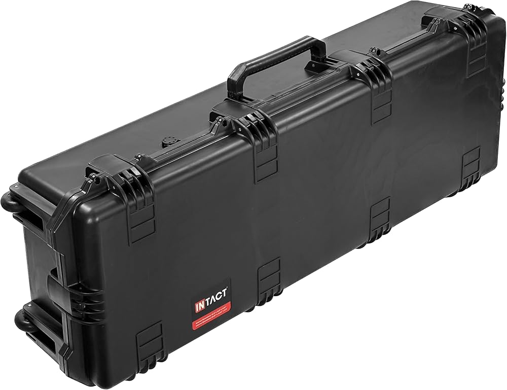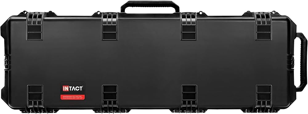 Introducing the Intact 47-inch protective deep rifle hard case from Eylar, perfect for securely transporting or storing your rifles. This hard case is designed for easy portability, featuring external dimensions of 47.2" x 16.5" x 9.21", and internal dimensions of 44.01" x 14.01" x8.5", which provides ample space for your firearms. Crafted from reinforced high-pressure polypropylene plastic, this case exhibits exceptional durability and protection. This 47 inch deep case includes 5 pieces of foam padding: 1 convoluted foam, 3 pull and pluck, and 1 solid bottom pad to ensure your rifles stay in place during transport. The case also includes two padlock adaptable fittings and integrated solid roller wheels, offering secure storage and transportation options at home or on the go. With a limited lifetime warranty, this Intact 47 inch Premium Deep Rifle Case by Eylar is built to last. It provides reliable protection for your firearms, making it an essential item for any gun enthusiast.