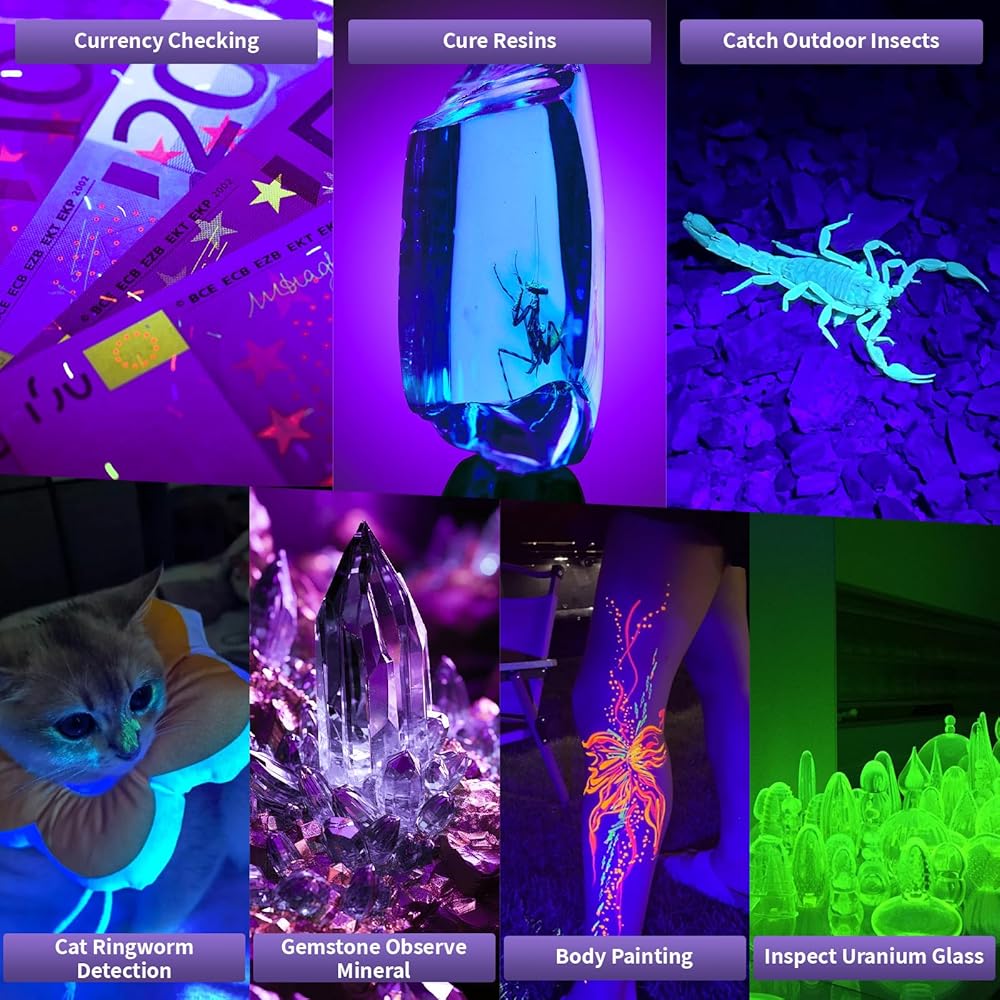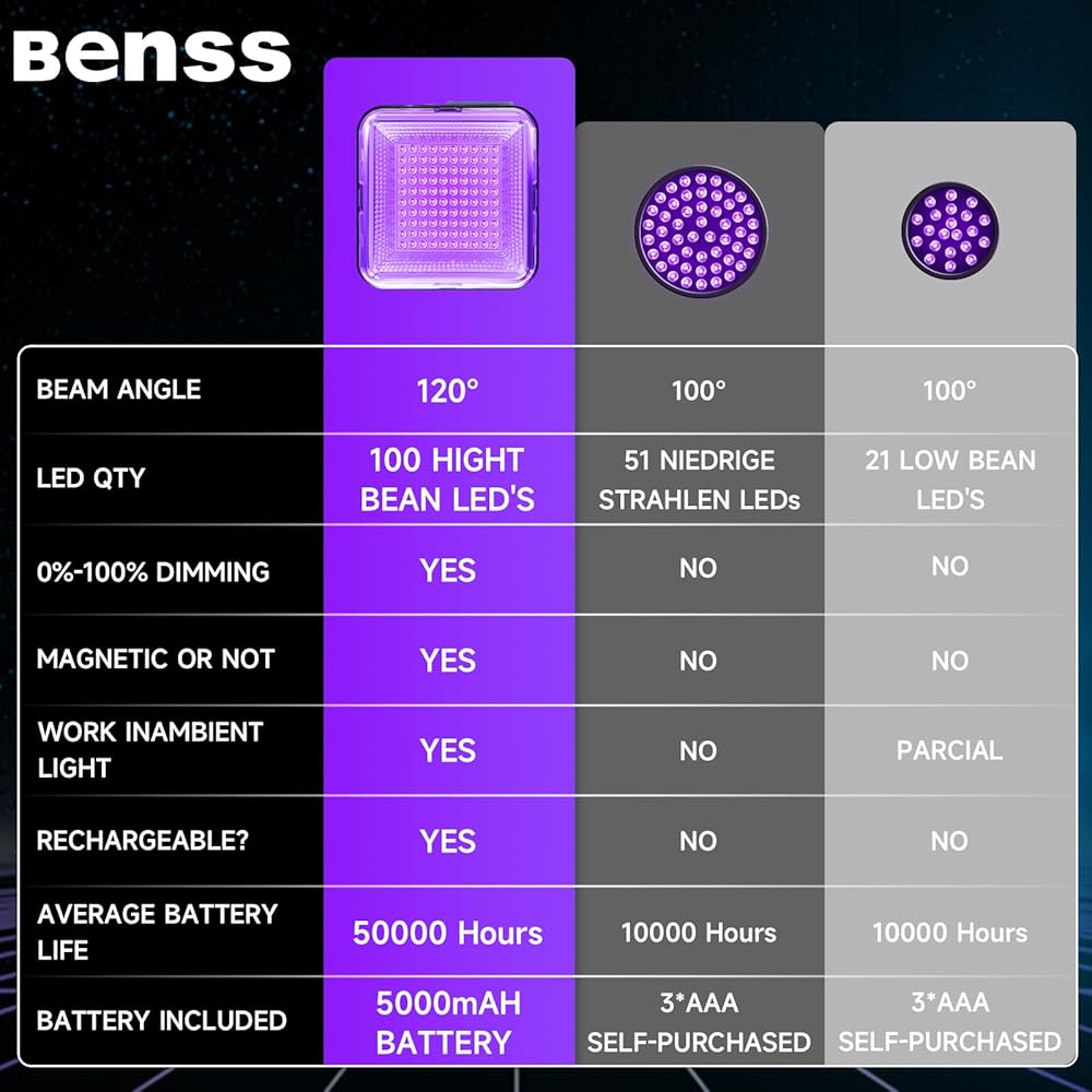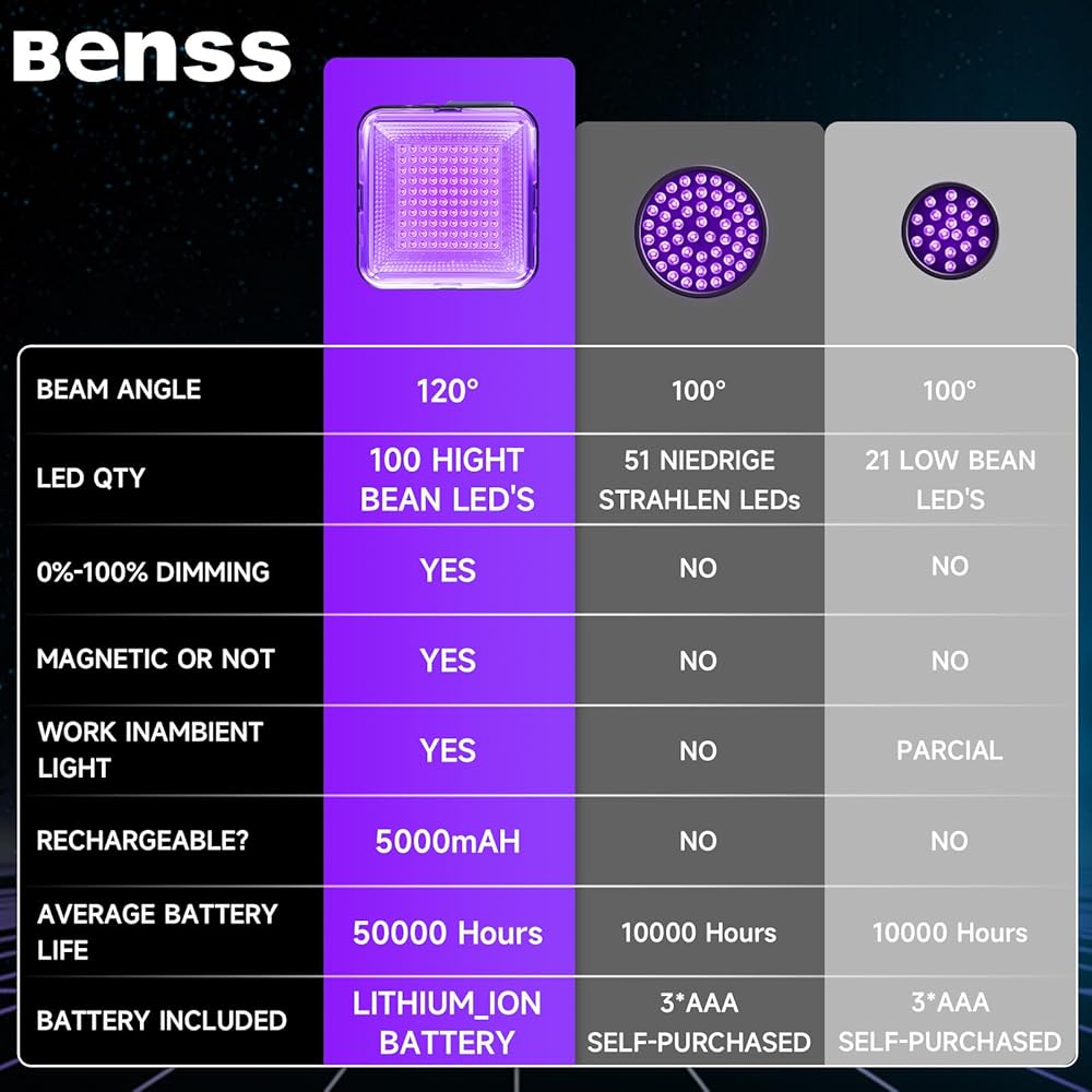 رقائق الضوء السوداء المؤيدة للصف-Benss Black Light للكشف عن بول الحيوانات الأليفة مناسب للكشف عن البقع الجافة من الكلاب والقطط. يمكن أن تعمل بسهولة على العقارب ، وتصديق العملة ، والتحقق من المعرفات الرسمية وجوازات السفر ، كما يمكن أن تعمل كمجفف الأظافر. رقائق ترقية لمزيد من الضوء تركيز. مع ضوء كاشف البول هذا (385-395NM) ، فإنه يساعدك على فحص بقع البول للحيوانات الأليفة في جميع الغرف في غضون ثوان! لا مزيد من تنظيف السجاد الأعمى ، لا مزيد من القلق من البقع غير المرئية على الأسرة أو الأرضيات أو المطبخ