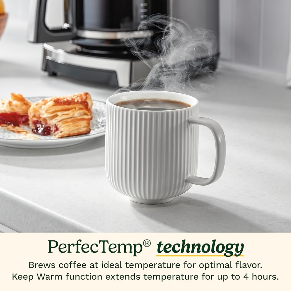"Brew fresh, full-flavored coffee hotter and faster with the innovative PerfecTemp® 14-Cup Programmable Coffeemaker. PerfecTemp heating technology ensures you always get piping-hot coffee with less waiting and without sacrificing flavor. Customize your coffee experience with 1-4 cup settings and adjustable 24-hour start and auto-shut-off times. Extend the Keep Warm function for an extra 30 minutes to maintain the perfect temperature for up to 4 hours. The charcoal and gold-tone filters work together to produce the fullest, freshest flavor, and the over ice function gives you the option to enjoy refreshing iced coffee at the touch of a button. Simple to use, with an intuitive control panel, front-fill water reservoir, and easy-pour carafe, this coffeemaker makes brewing your best coffee easy. "