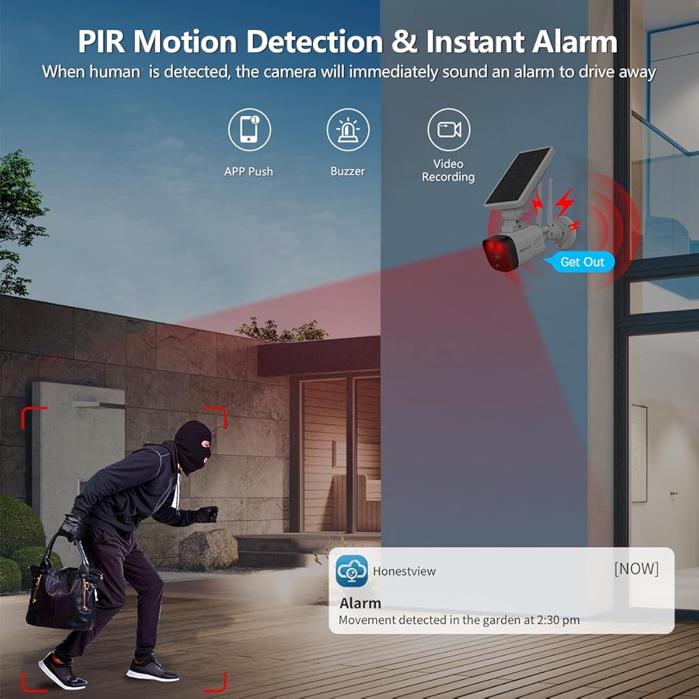 {Smart PIR Motion Detection and Alerts} تم تجهيز كاميرات الأمان التي تعمل بالطاقة الشمسية اللاسلكية بنظام اكتشاف حركة PIR الذكي ، والذي يمكنه تحديد الأشخاص أو الحيوانات أو الأشياء الأخرى بشكل فعال في منطقة المراقبة. سيتم تسليط الضوء على الأرقام البشرية بإطار أحمر ، وستتلقى إشعارات من خلال التطبيق أو البريد الإلكتروني.