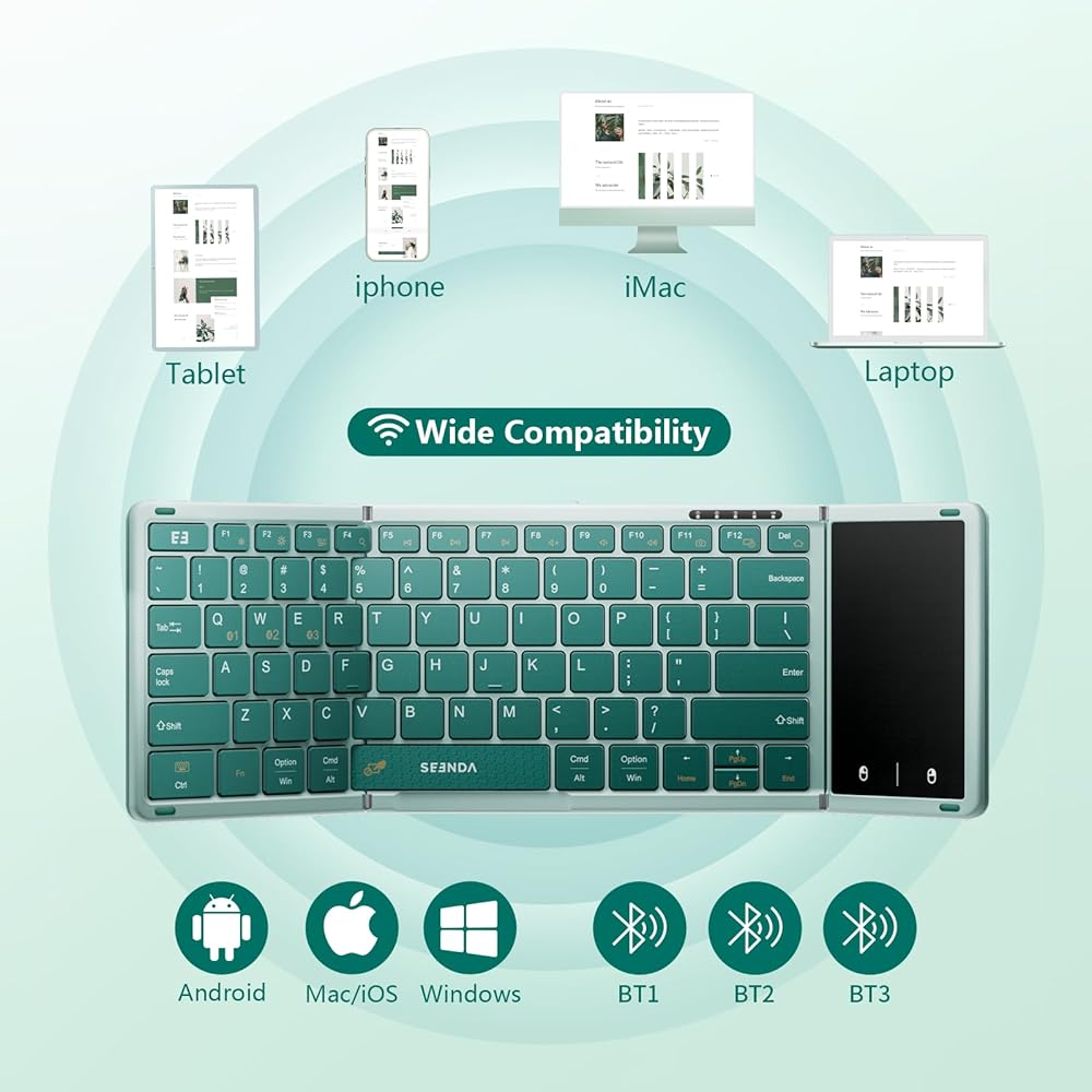 【قم بتوصيل ما يصل إلى 3 أجهزة】 لوحة المفاتيح القابلة للطي مع لوحة اللمس تدعم 3 أجهزة للاتصال في نفس الوقت ، والتبديل السلس دون تأخير وتعزيز كفاءة العمل. متوافق مع Windows/Mac OS/iOS/Android. سواء كنت تستخدم جهاز iPad أو الهاتف أو الكمبيوتر اللوحي أو الكمبيوتر المحمول ، فإن لوحة المفاتيح Bluetooth هذه تتيح لك التبديل بين الأجهزة والاستمرار في الكتابة دون فقدان إيقاع.