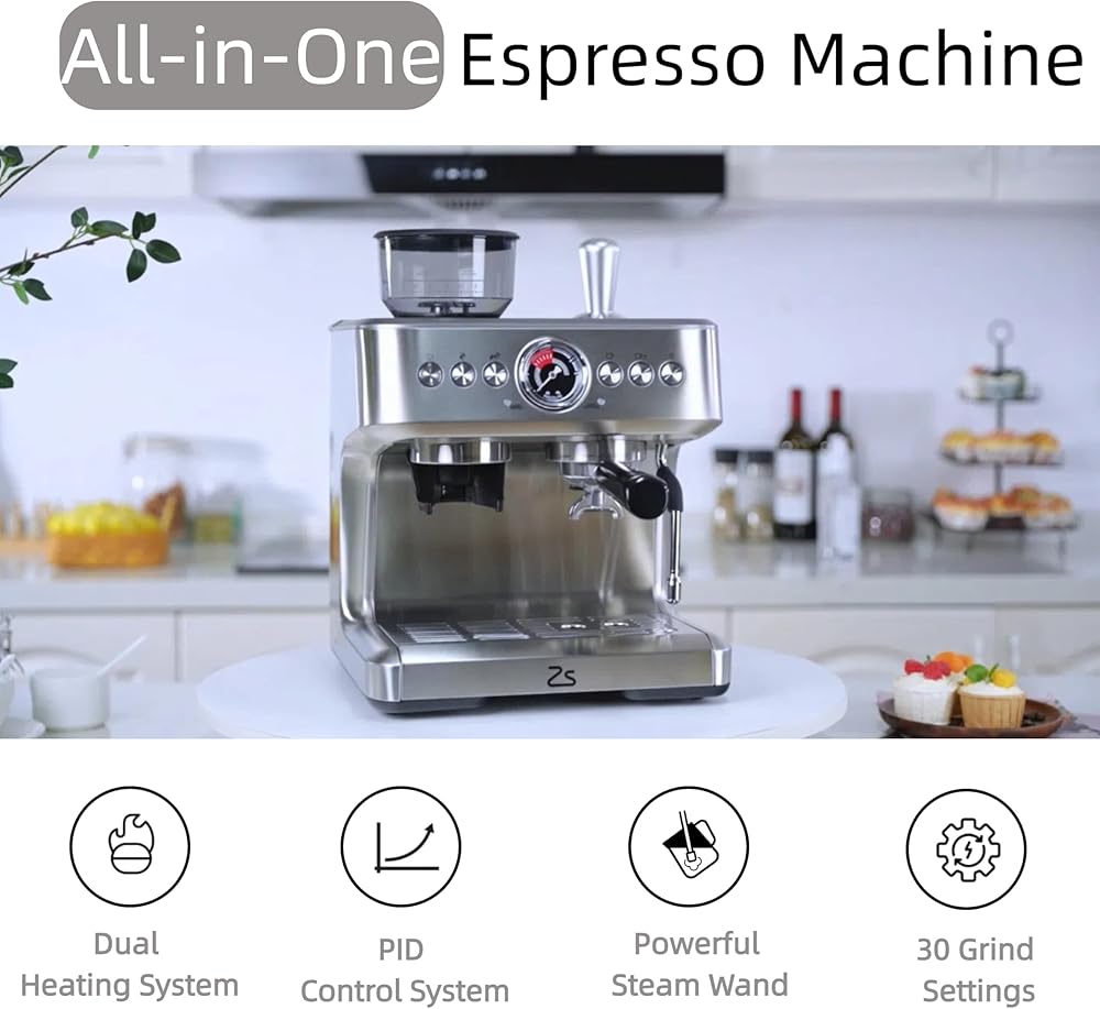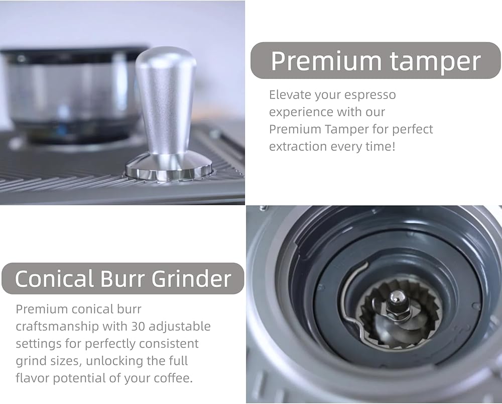 • [30-Settings Conical Burr Grinder] أحجام الطحن القابلة للاختيار لاستيعاب مختلف حبوب القهوة وإرضاء تفضيلات الذوق المتنوعة. سواء كنت تفضل إسبرسوًا قويًا أو صبًا لطيفًا ، فإن آلة الإسبريسو هذه مع مطحنة تتولى كل شيء بسهولة