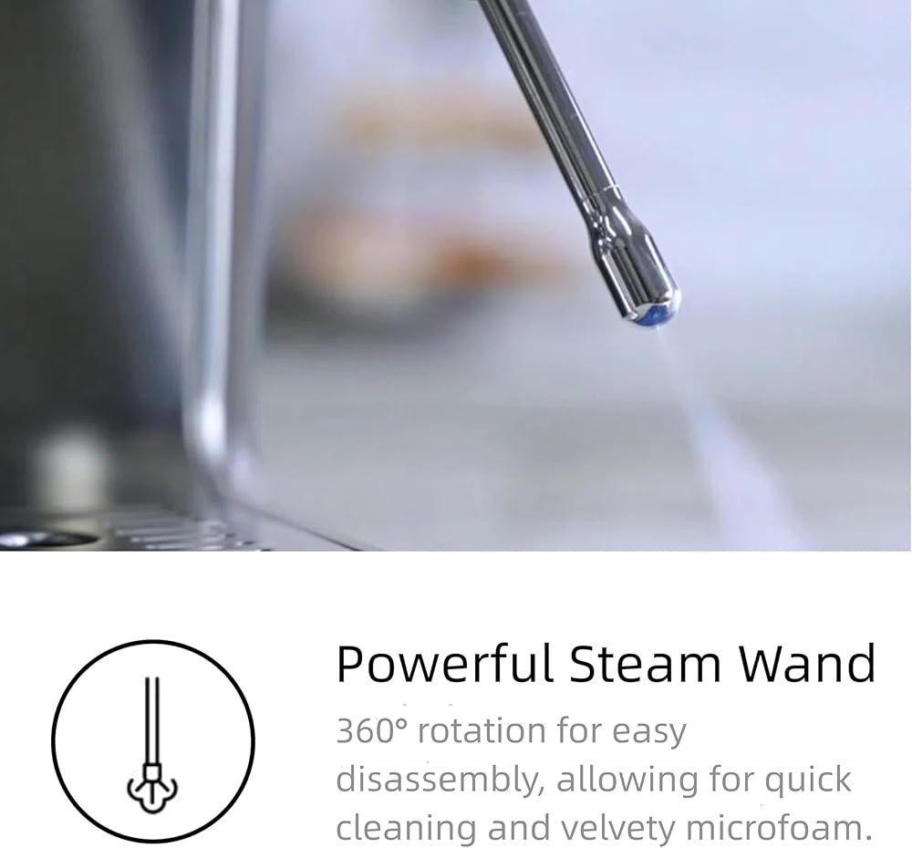 • [عصا البخار القوية] تخلق بسهولة زبد كثيف وكريمي مثالي لمشروبات القهوة المختلفة. نصيحة: ضع عصا البخار على سطح السائل للمساعدة في دمج الهواء لزبد مثالي! هذه الميزة أمر لا بد منه في أي صانع القهوة مع طاحونة