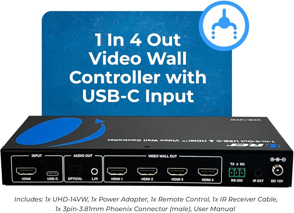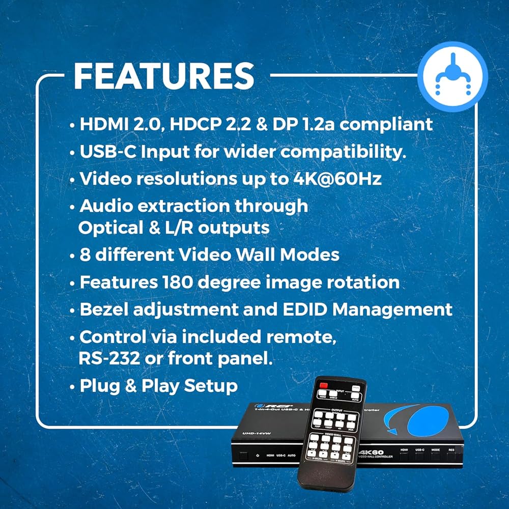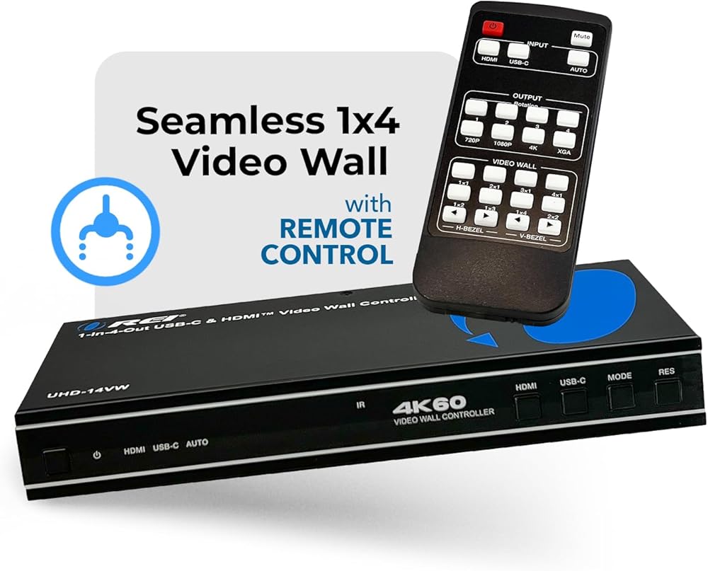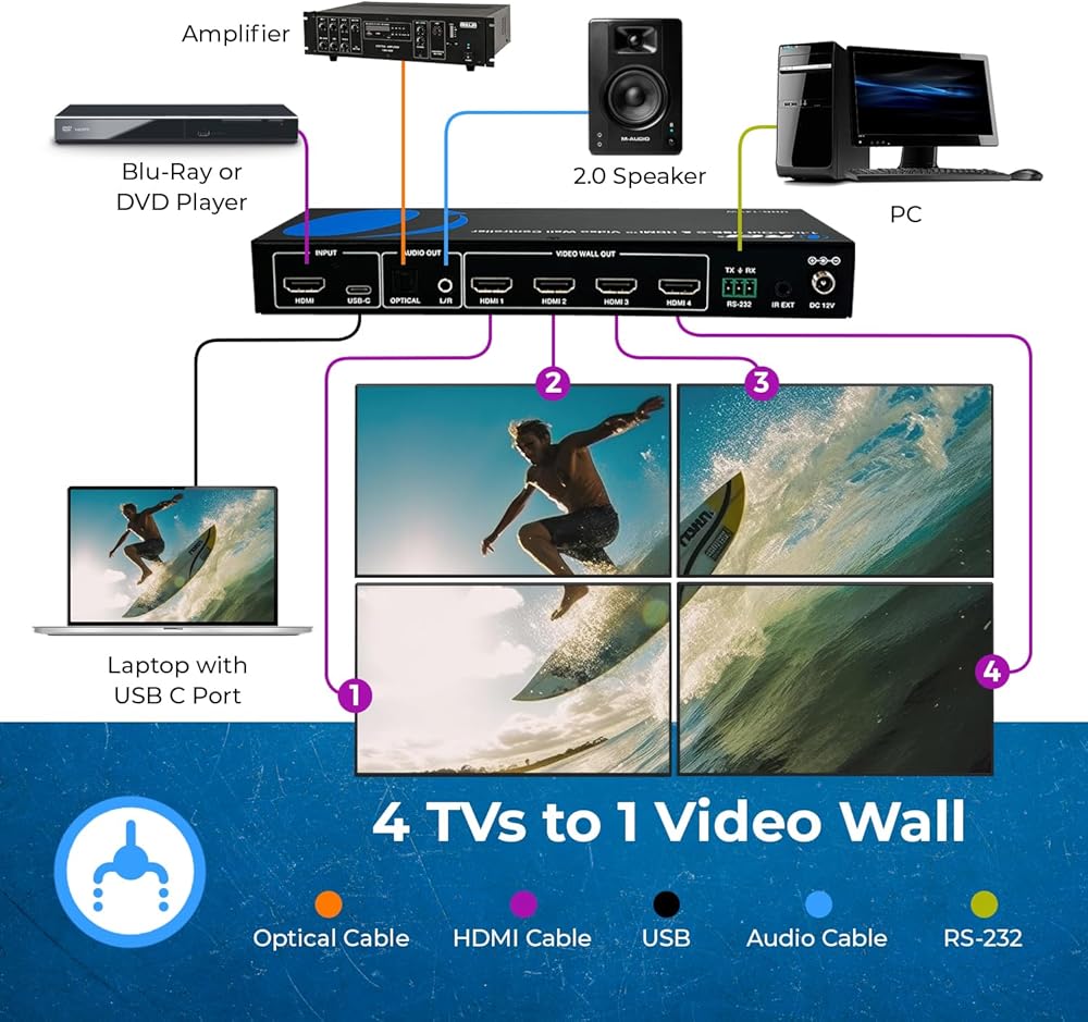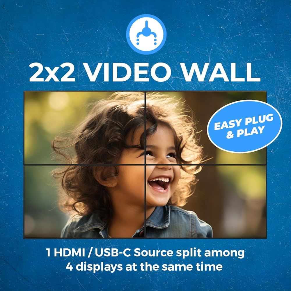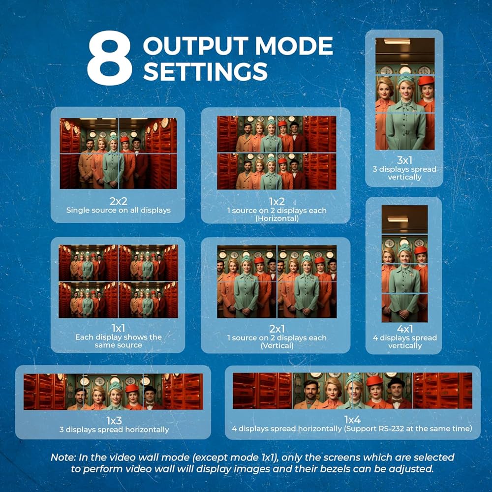 Multiple Display Modes - 4x4 2x2, 1x2, 2x1, 1x3, 3x1, 1x4, 4x1 (1080i each Display) and 1x4 Splitter/Matrix Mode (Display the same or 8 individual sources on all 4 TVs @ 4K Each Display)