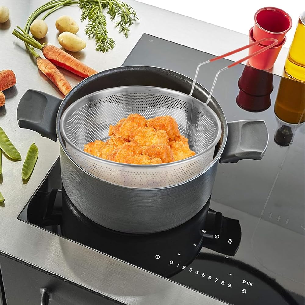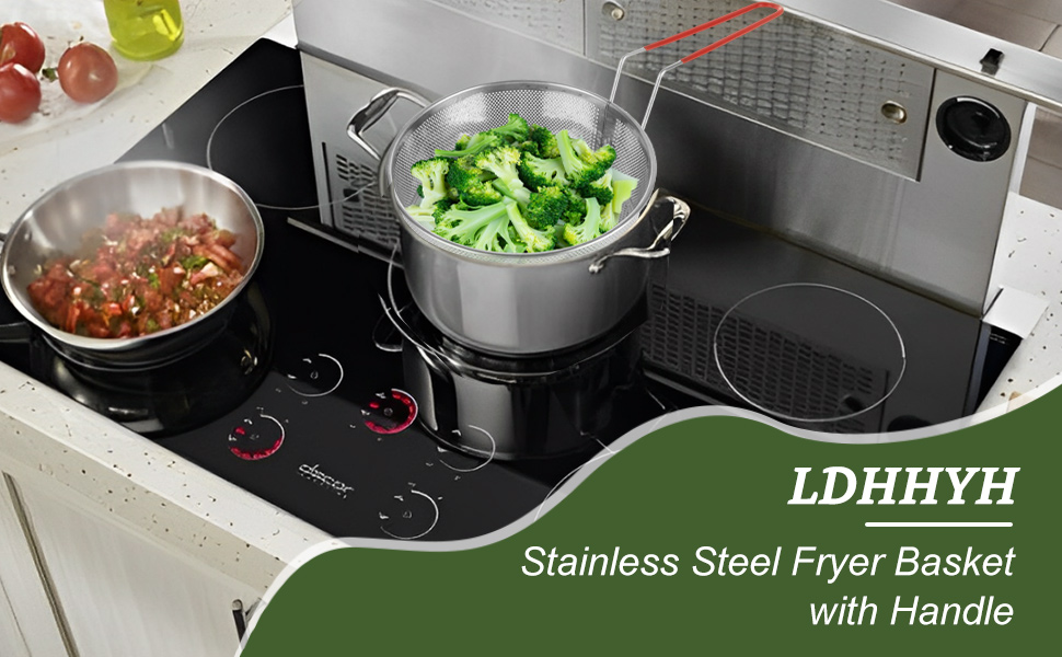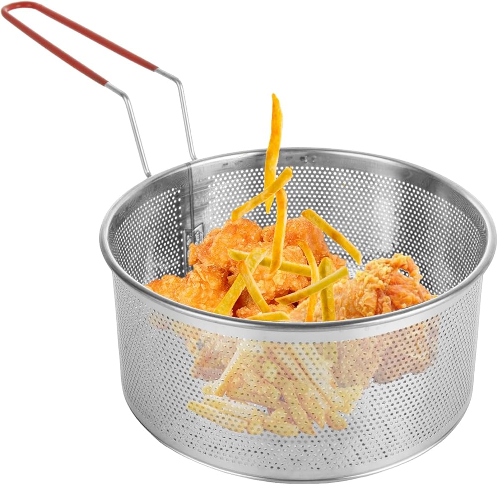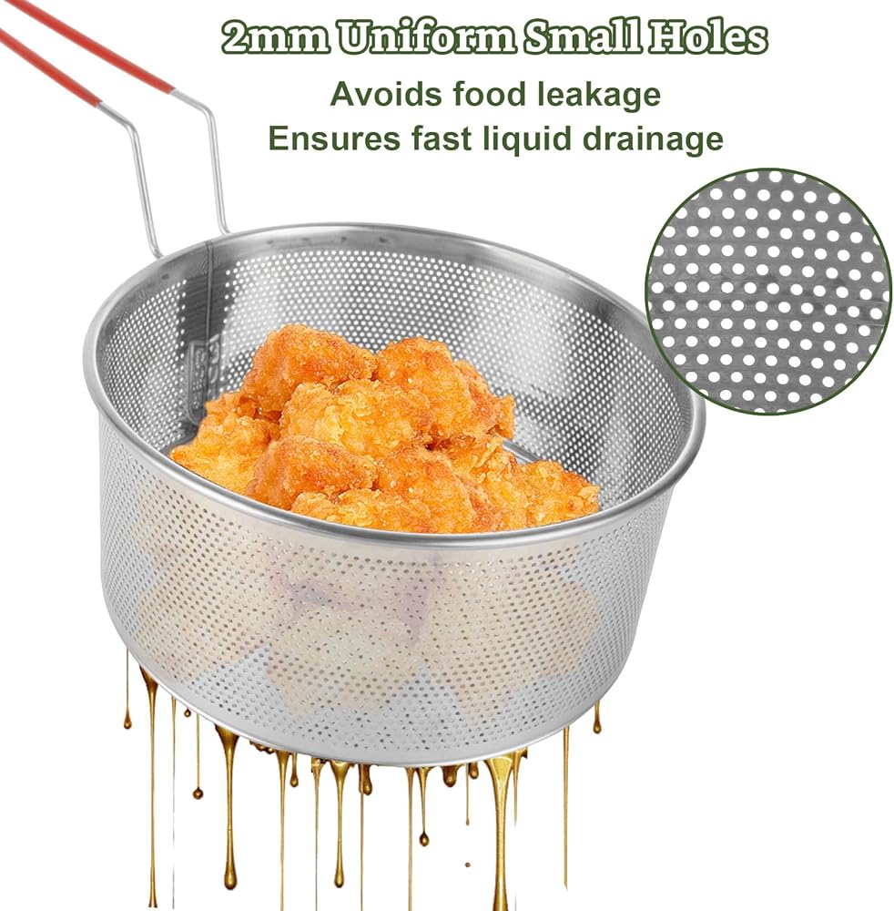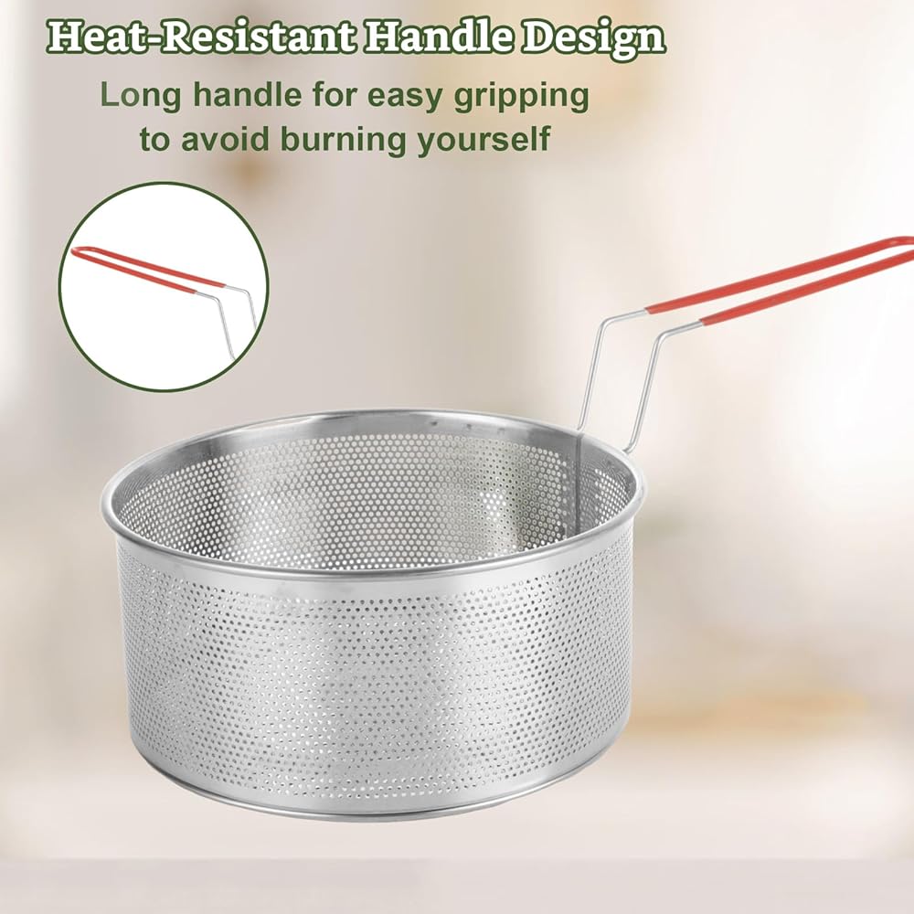 تصميم المقبض: تتميز سلة القلي هذه بمقبض طويل مقاوم للحرارة مصمم تمامًا لسهولة الاستيلاء. يسمح لك برفع الطعام بأمان وبسهولة من المقلاة بعد الطهي لتجنب حرق نفسك ، لاستخدامك اليومي