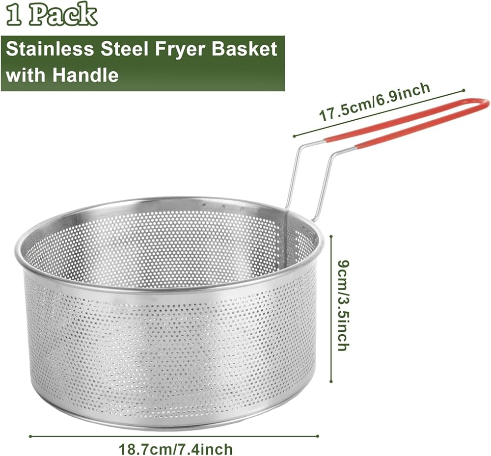 تشمل الحزمة: تتضمن كل حزمة سلة واحدة من الفولاذ المقاوم للصدأ من الفولاذ المقاوم للصدأ مع مقبض ، وحجم سلة المقلاة العميقة هو 20 × 9.5 سم / 8 × 4 بوصة (ديا الوجبات الخفيفة المقلية الأخرى