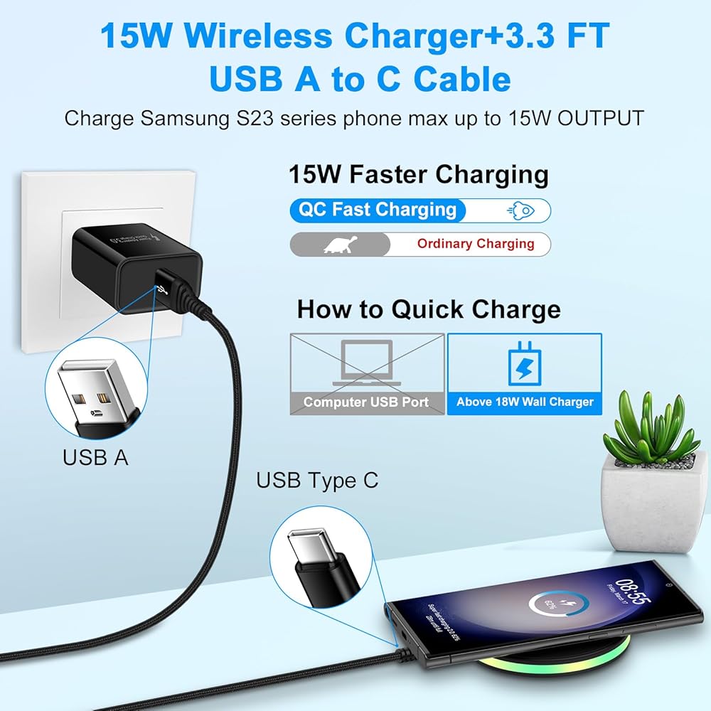 • 【15W Wireless Charger Fast Charging】: 15W fast phone wireless charging pad provides up to 15W wireless fast charging for Samsung Galaxy Z Fold 6 5 4 5G, Z Flip 6 5 4,S23 Ultra S24,S24+,S24 Ultra,S23+ 23,S22 S22+ S22 Ultra 5G,S21 S21+ S21 Ultra 5G S21 FE,S20 S20+ S20 Ultra 5G S20 FE,Note 20 Ultra 20; Motorola Moto Edge 2024 2022,Edge+ 2023,Edge 40 Pro 40; Google Pixel 8a 8 Pro 8 7 Pro 7 6 Pro 6; LG Wing,Velvet,G8 V60 V50 ThinQ and so on. Please usb an above 18W Wall Charger Power Adapter.