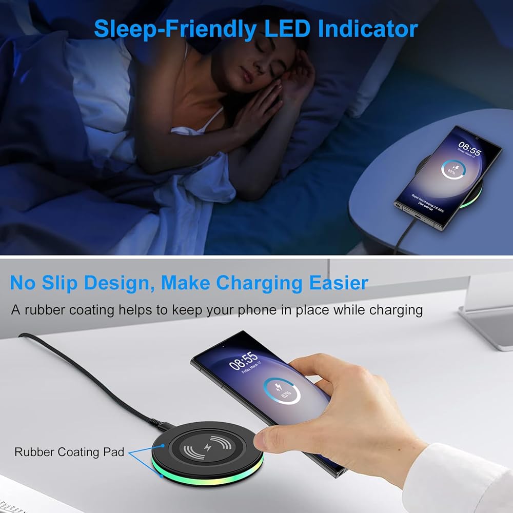 • 【Safer Protection】: The wireless charger iphone always charges your cell phone safely and securely. When the anti-iPhone appears overcharging, overcurrent, overvoltage, overheating or short circuit. With weak light, it will not affect your sleep. Package: 1 x Fast Wireless Charger Pad, 1 x 3.3 Feet USB A Android Charger Fast Charging Cable. 7x 24 Hours friendly customer service. If you have any questions, please feel free to contact us.