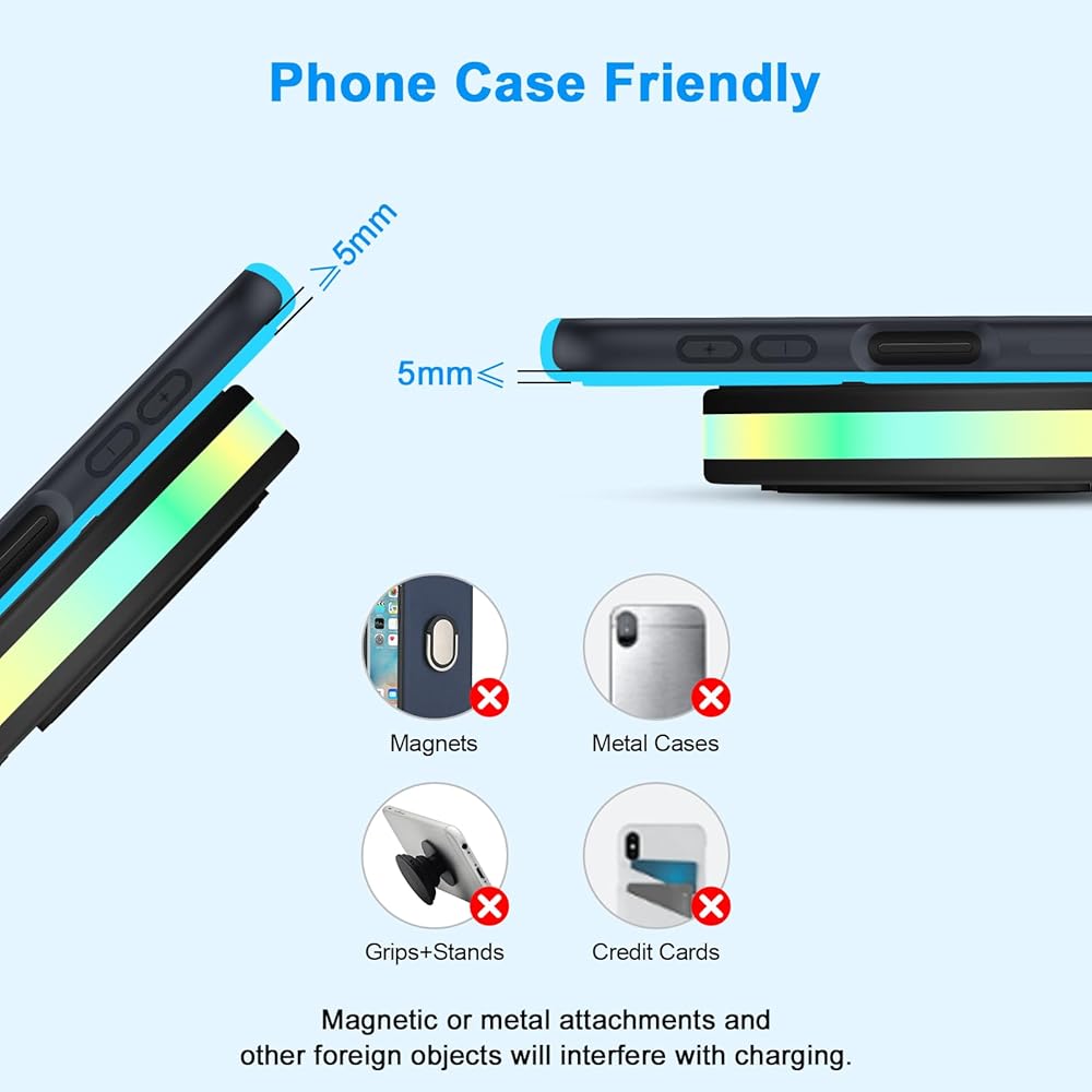• 【Easy Wireless Charging and Case friendly】: Put your phone in the middle of the wireless charging pad, charge it up. Wireless charge mat back and the bottom are covered by anti-skid silicone to protect your device from slide. Inductive charging directly through protective cases up to 6mm/0.23inch thick. Note: Cases with magnetic or metal attachments is infeasible.