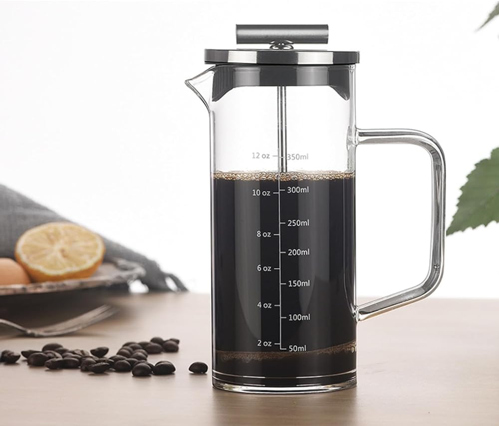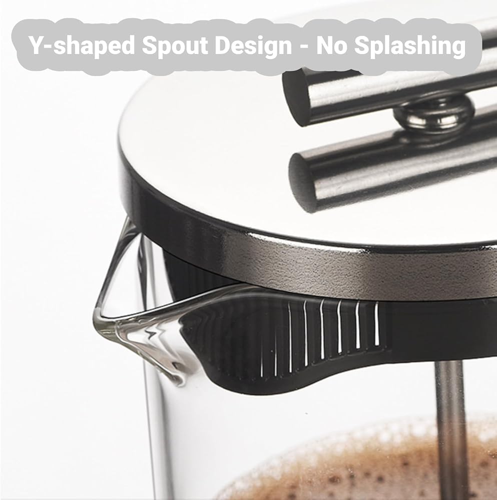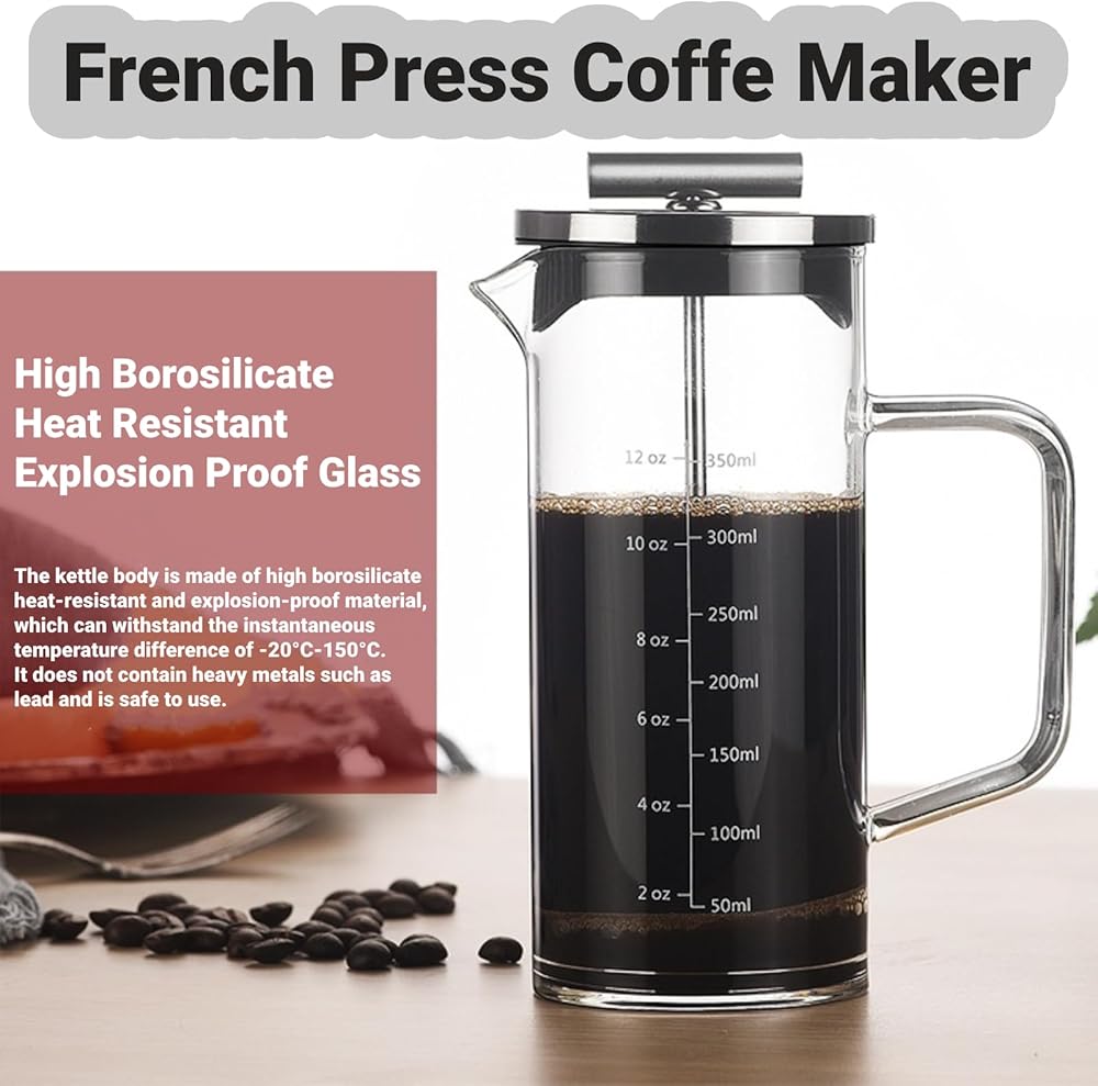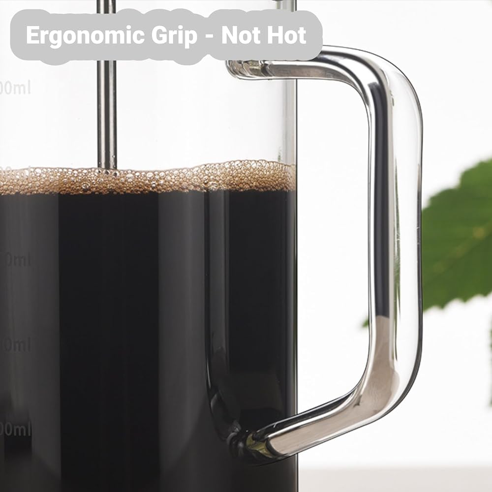 • Premium Quality Materials: Made from food-grade borosilicate glass, this French press is both heat-resistant and The ergonomic glass handle ensures a comfortable grip, making your coffee-making experience effortless.
