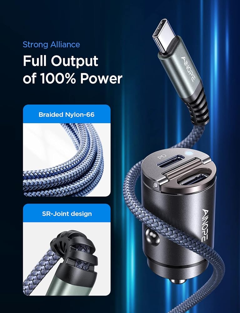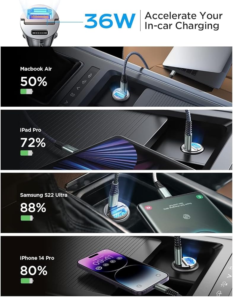 Ainope Car Charger USB C 72W USB C Char Charger PD36W & QC36W ، جميع الشاحن المعدني USB C Car Fast Charger QC3.0 شاحن USB سجائر مع 3.3 قدم USB C إلى USB C Cable Fits iPhone 16 Pro Max