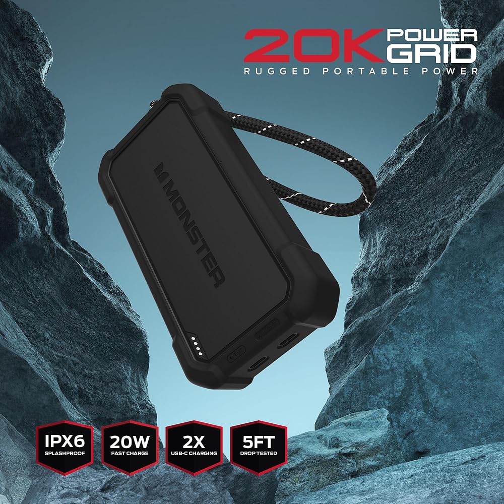 Monster 20000mah Grid Pro Power Bank ، شحن سريع 65 واط مع منافذ USB-C المزدوجة ، واشتراكها للبلاش ، وتصميم متين مع محول USB-A إلى USB-C (20000 مللي أمبير في الساعة)