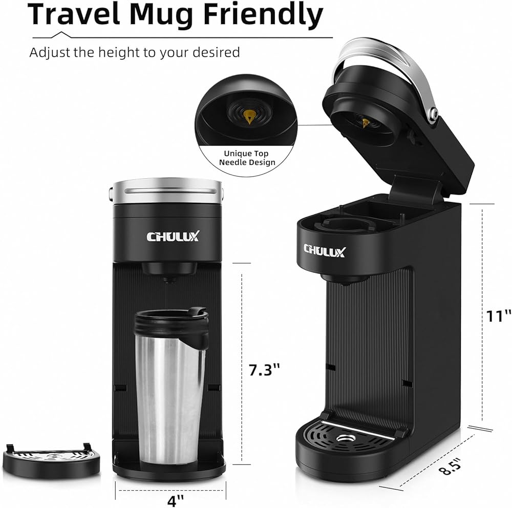 تصميم حجم السفر ومحمولة: أقل من 4.5 بوصة ، يتناسب بدقة على مساحتك المدمجة. إن Chulux Single Servine Coffee Brewer نحيف ، ويستوعب القدح الذي يصل إلى 5.3 بوصة عن طريق إزالة صينية التنقيط.