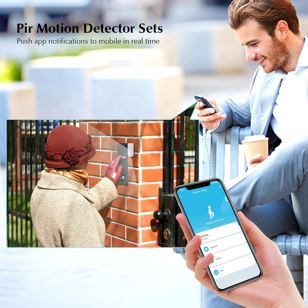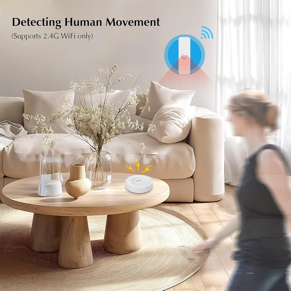 تنبيهات في الوقت الفعلي وإخطارات التطبيق: قم بتوصيل كاشف الحركة الذكي وإنذار صفارات الإنذار الذكية إلى WiFi ، وسيقوم إنذار كاشف الحركة على الفور بإرسال إعلامات التطبيق إلى هاتفك وتنبيهات إنذار صفارات الإنذار الذكية 100 ديسيبل عندما يدخل شخص مشبك إلى الغرفة ، حتى لو أنت لست في المنزل. (يدعم 2.4G WIFI فقط ، لا يدعم 5G WiFi)