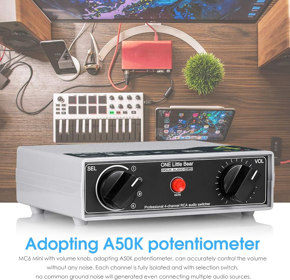 • MC6 Mini with volume knob, adopting A50K potentiometer, can accurately control the volume without any noise. Each channel is fully isolated and with selection switch, no common ground noise will generated even connecting multiple audio sources.