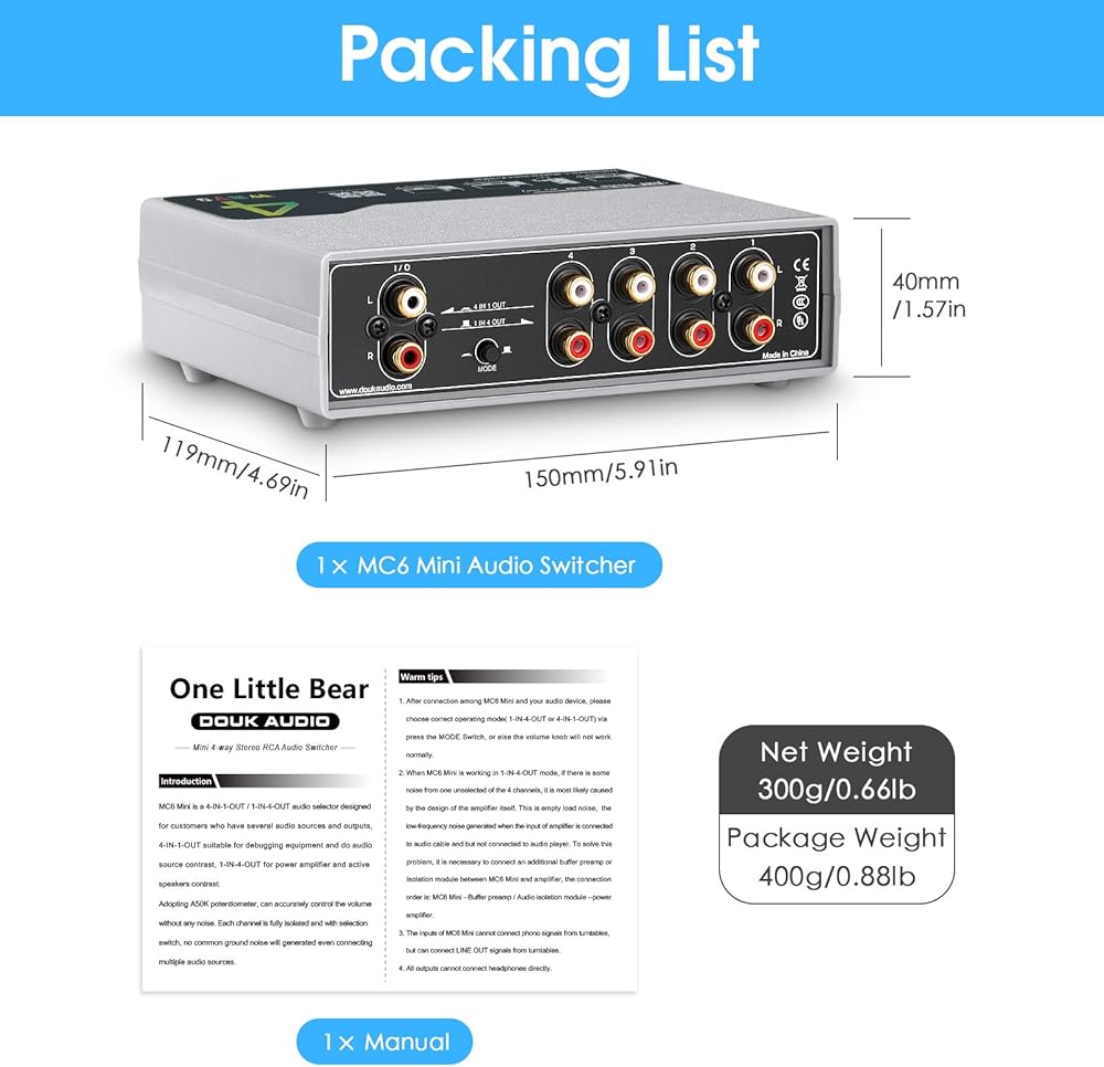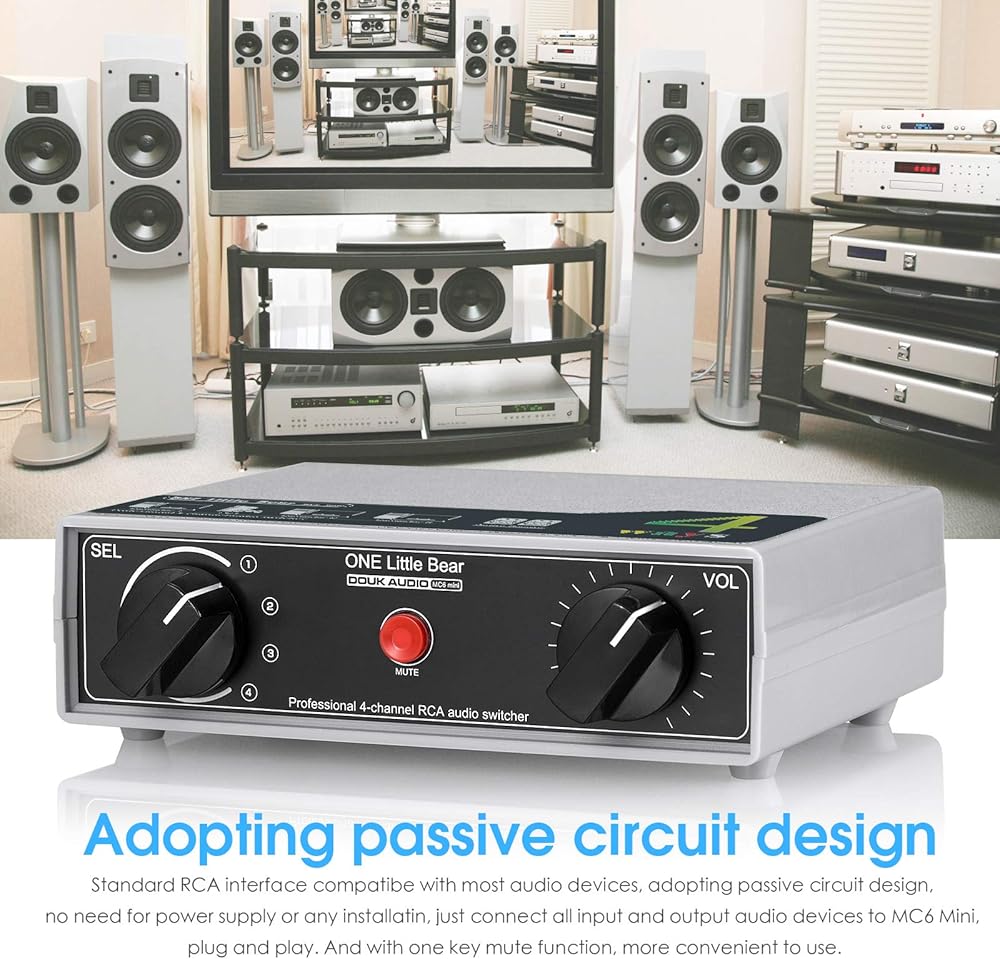 • Standard RCA interface compatibe with most audio devices, adopting passive circuit design, no need for power supply or any installatin, just connect all input and output audio devices to MC6 Mini, plug and play. And with one key mute function, more convenient to use.