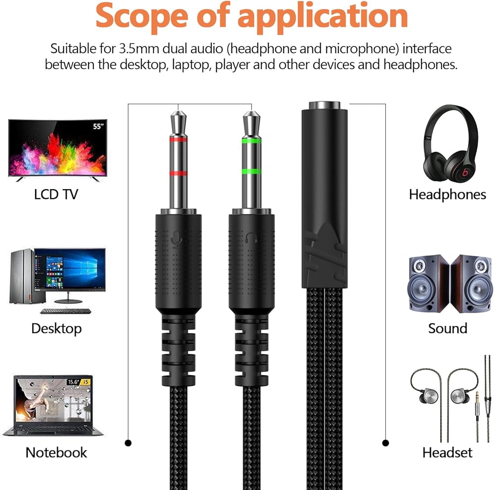 • 【توافق عالمي】 3.5 مم محول صوت ستيريو MIC ، يمكنك توصيل سماعات الرأس الأحدث (مقبس التحرير والسرد الصوتي والميكروفون) بجهاز كمبيوتر أو كمبيوتر محمول للاستخدام مع تطبيقات VoIP ، مثل Skype أو Chat Program .