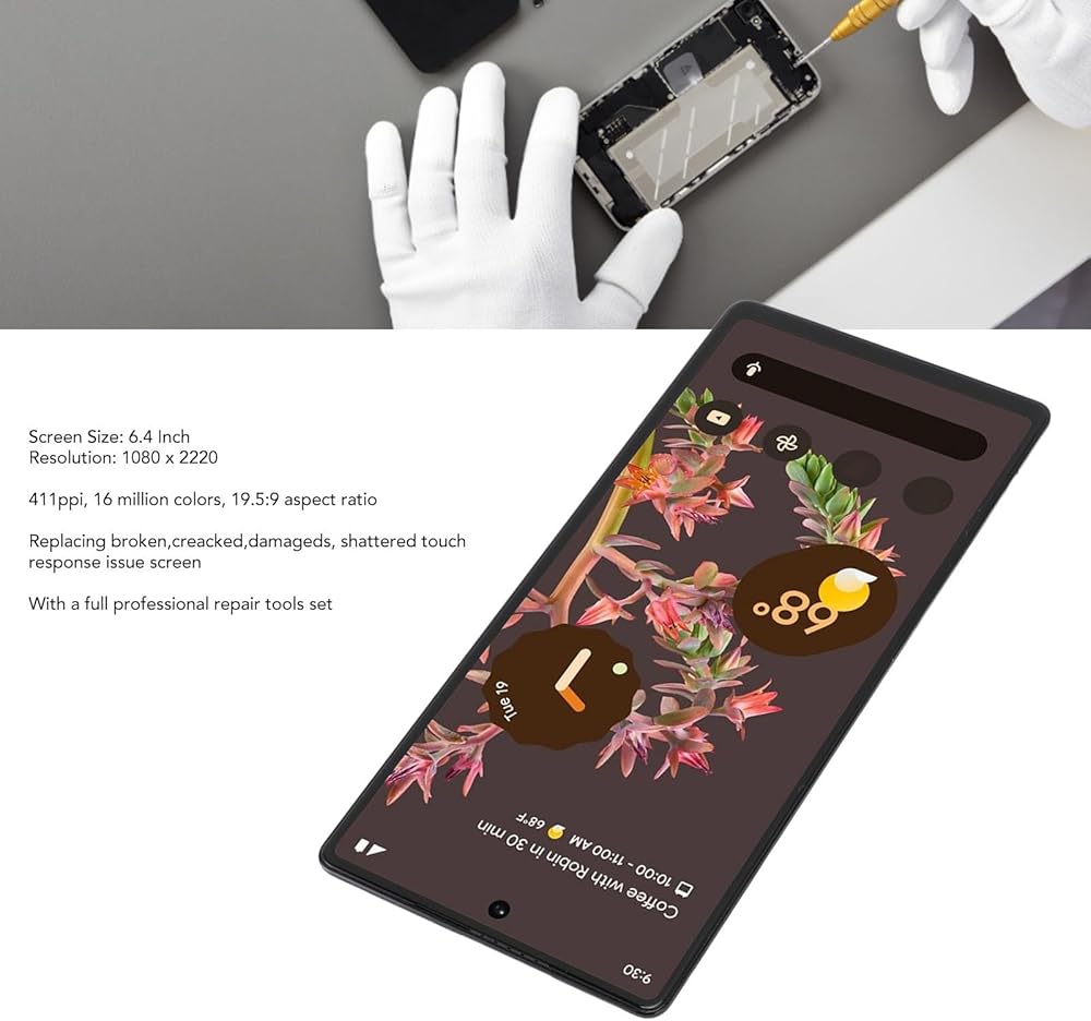 استبدال العرض المتوافق: مصمم خصيصًا لنموذج Google Pixel 6 GB7N6 G9S9B16 ، تتميز مجموعة أرقام شاشة العرض هذه بوظيفة متعددة اللمس ، ودقة 1080 × 2220 ، و 411ppi ، ودعم 16 مليون لون مع نسبة عرضية 19.5: 9. ويشمل مستشعر بصمات الأصابع ويتناسب على النحو الأمثل مع جهازك. يرجى التحقق من نموذج هاتفك قبل الشراء لضمان التوافق (غير مناسب لـ Pixel 6 Pro).