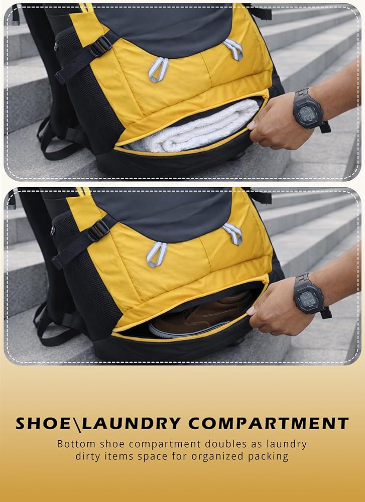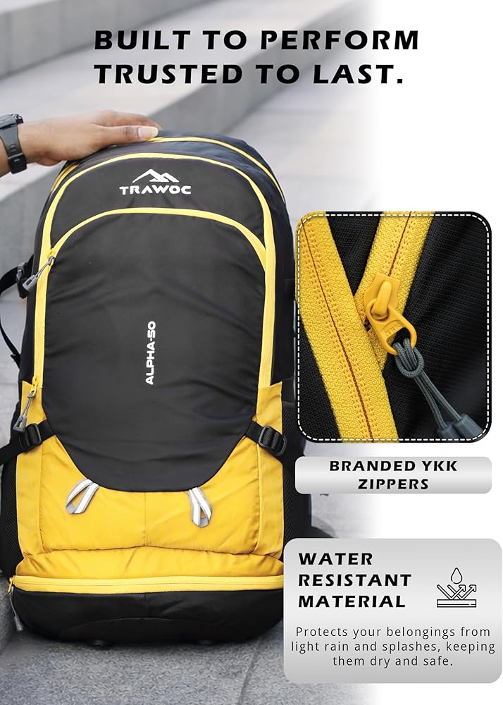 Alpha 50 لتر سفر على ظهر حقيبة ظهر مقاومة للماء لركوب الدراجات التخييم للمشي لمسافات طويلة للرجال والنساء ، الأصفر